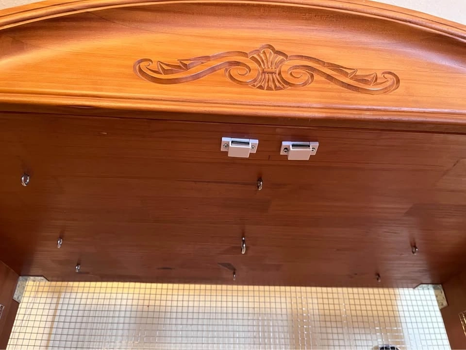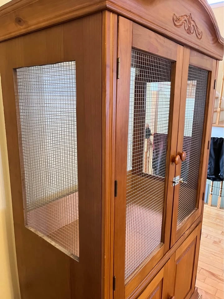 Custom made pine armoire turned flight cage. Stainless steel wire, nine eyeholes on ceiling to hang toys from, storage underneath. All toys and perches pictured included. Suitable for small birds such as budgies.