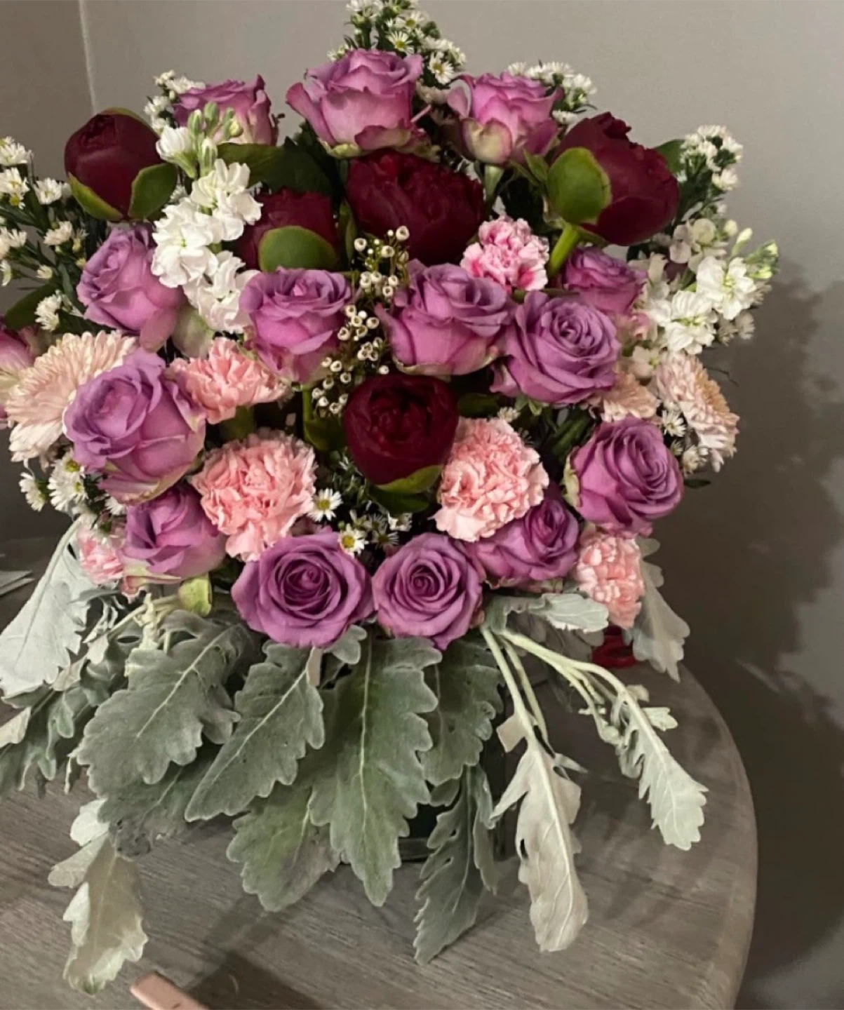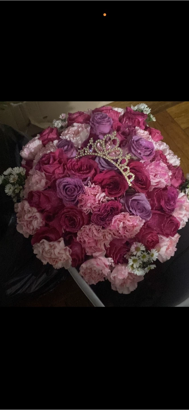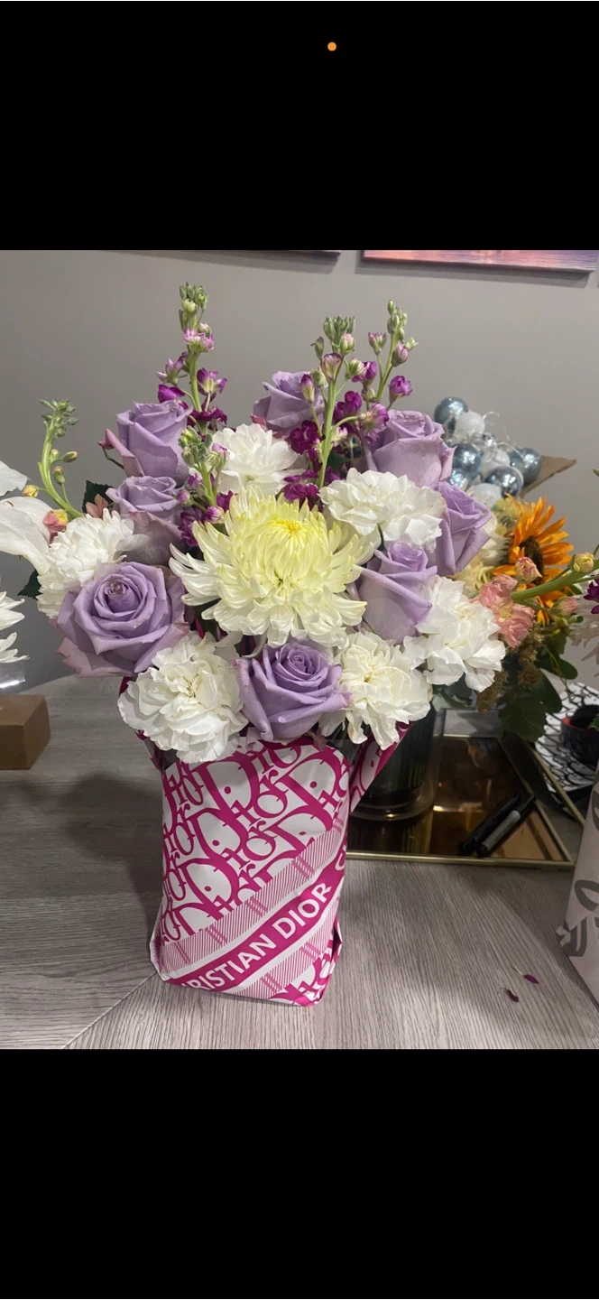 Beautiful floral arrangement featuring purple roses, white chrysanthemums, and accent flowers. Arranged in a unique vase covered in Dior-inspired fabric. It's a stunning piece for any occasion!custom orders available for pickup