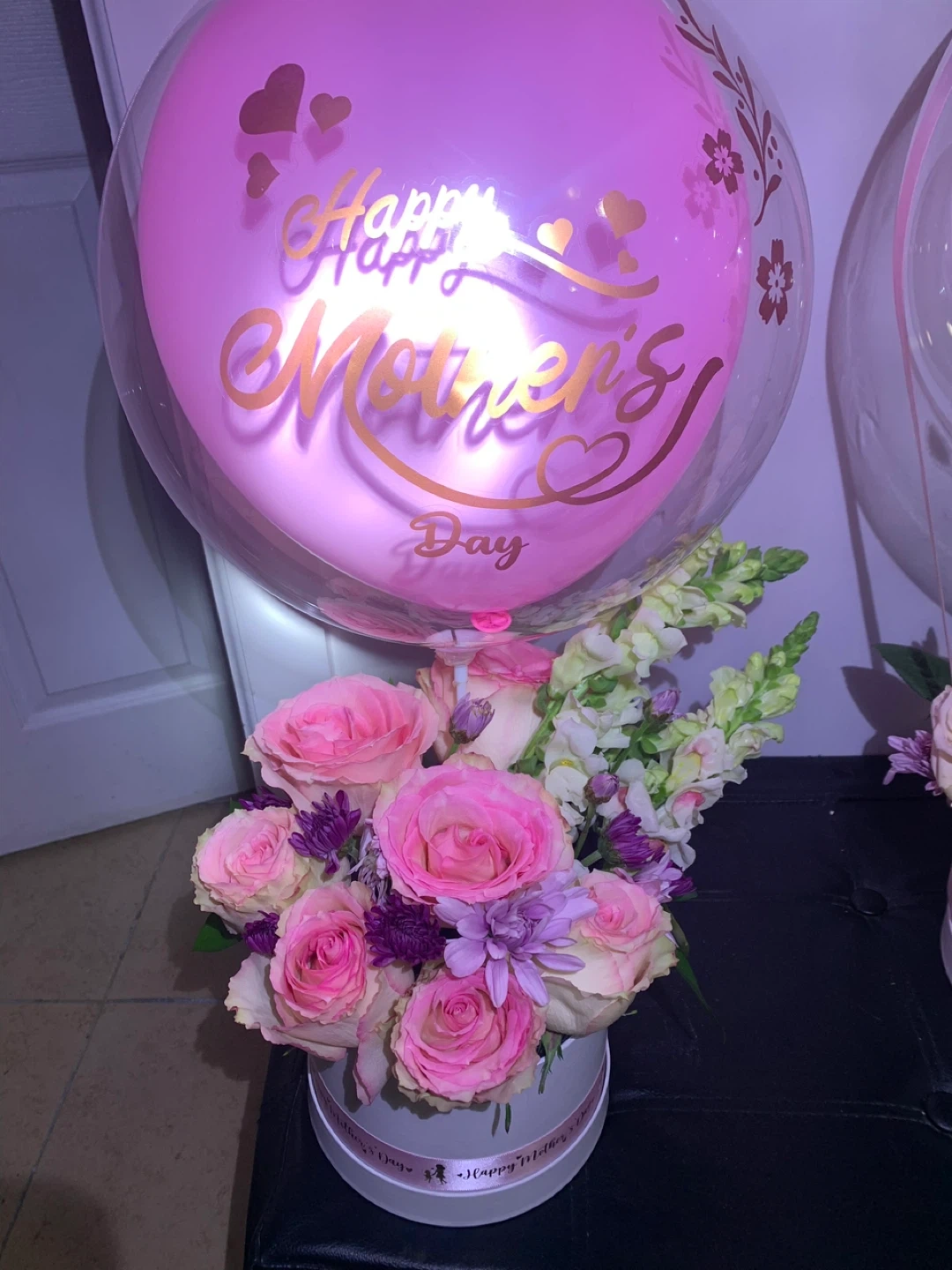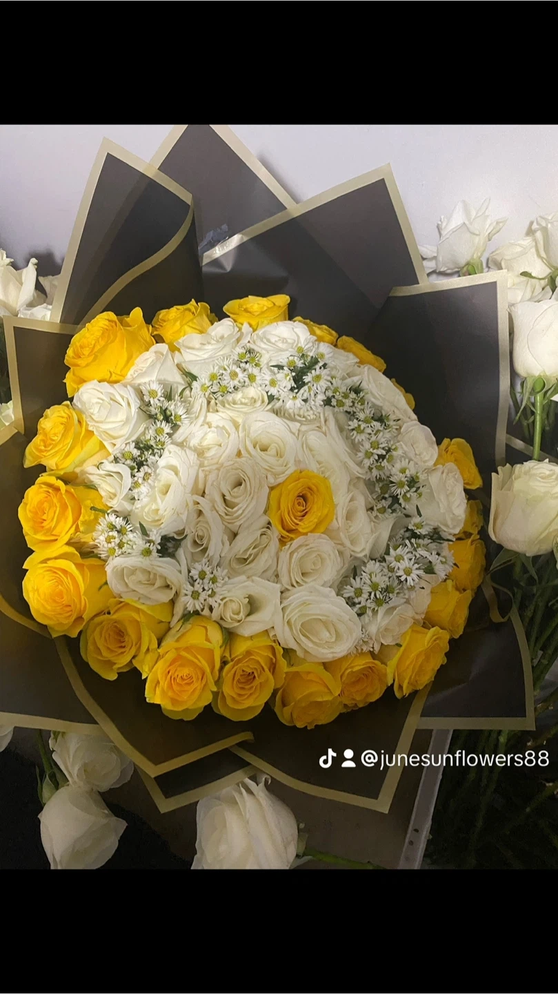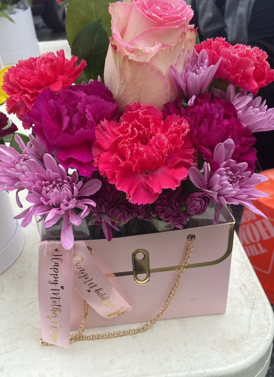 Beautiful floral arrangement featuring purple roses, white chrysanthemums, and accent flowers. Arranged in a unique vase covered in Dior-inspired fabric. It's a stunning piece for any occasion!custom orders available for pickup