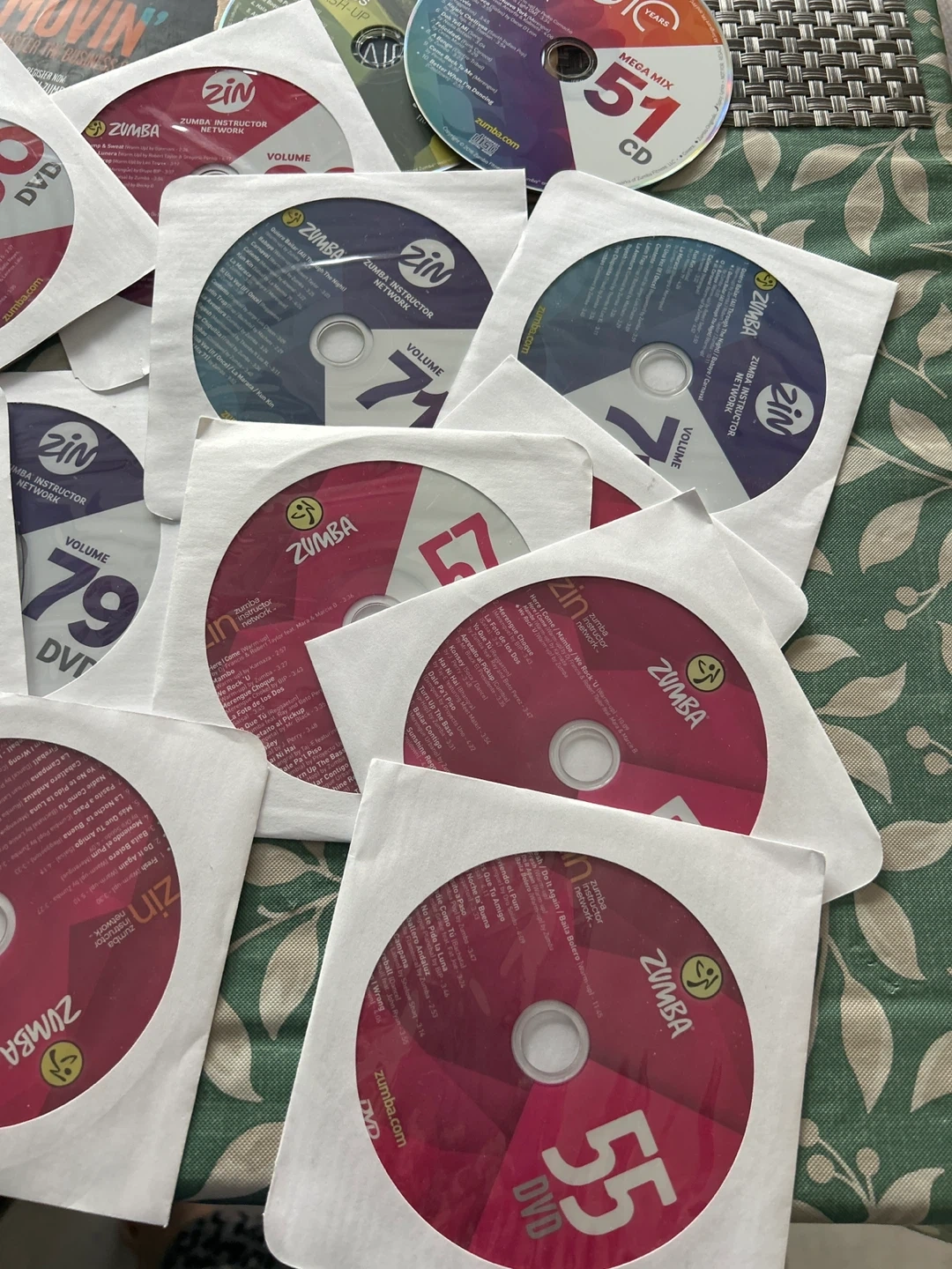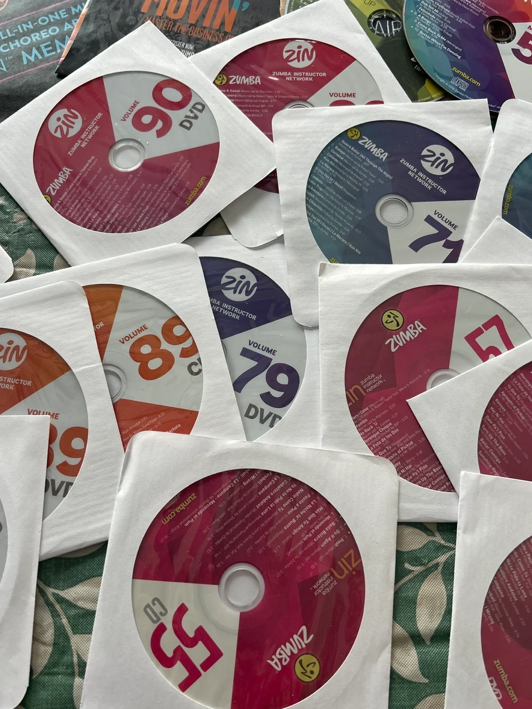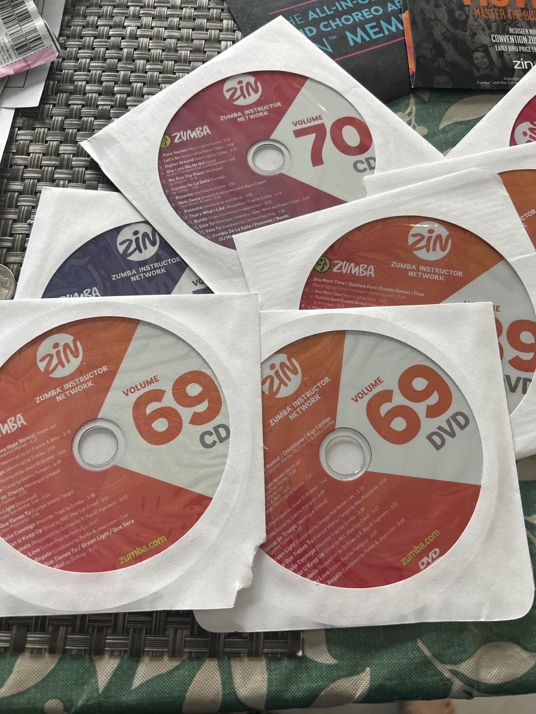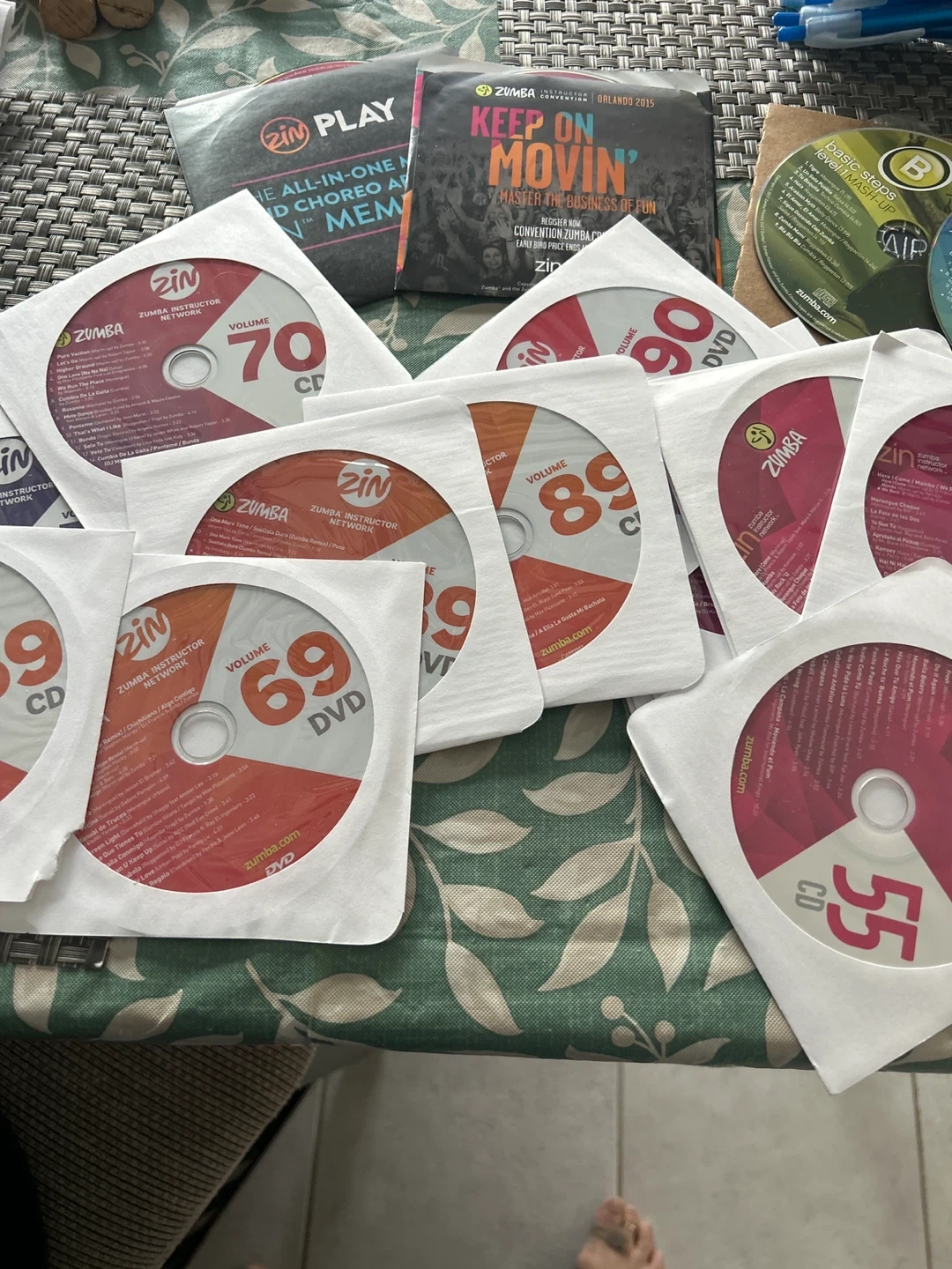 This set includes various Zumba Instructor Network (ZIN) volumes on CD and DVD. Each disc contains specific routines and music for instructors. Contents are ZIN volumes 55, 69, 70, 71, 79, 89, 90, and much more . Over 50 cds