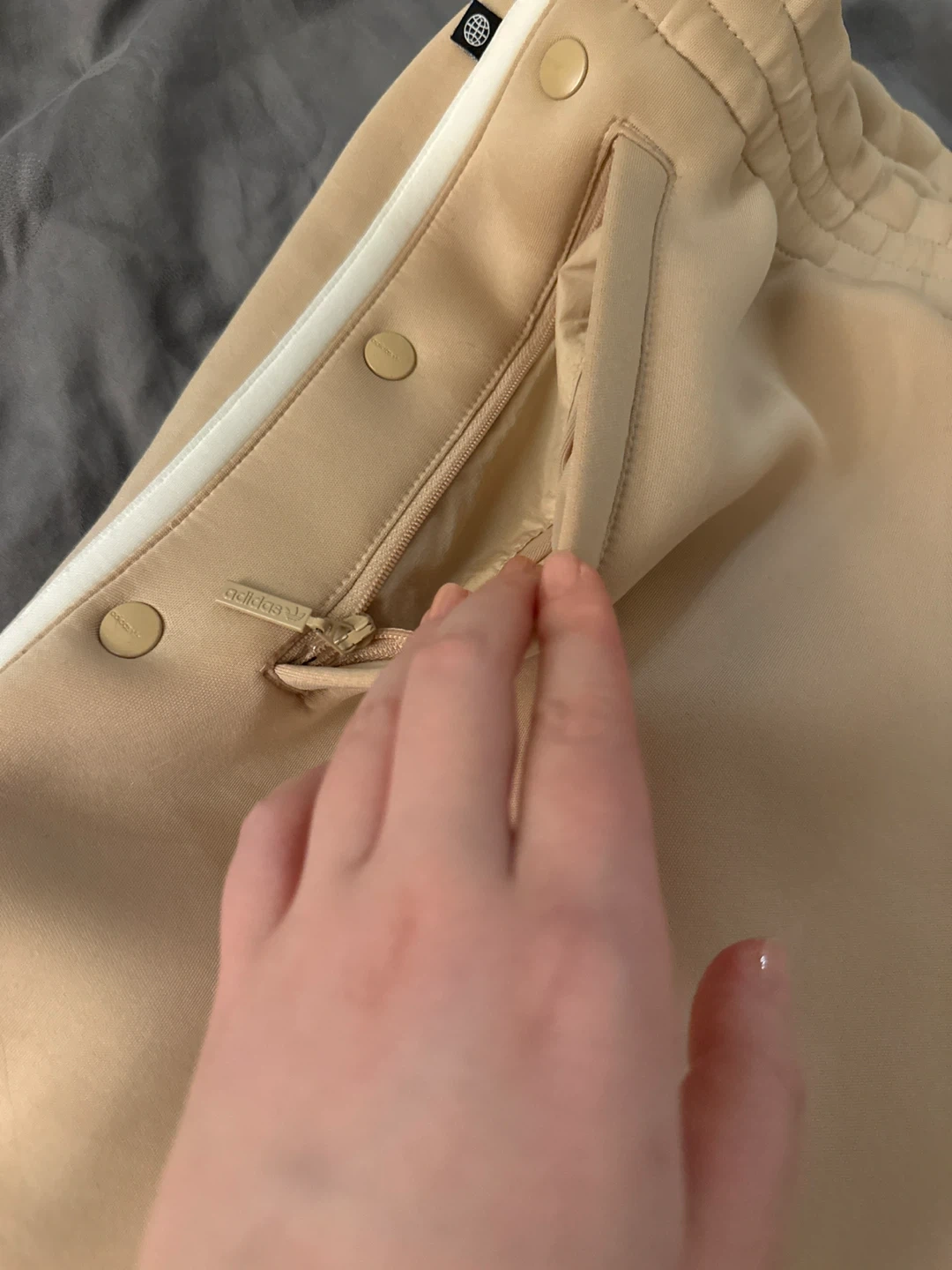 Adidas track pants in a light beige colour. Features snap buttons down the sides and a zippered pocket.