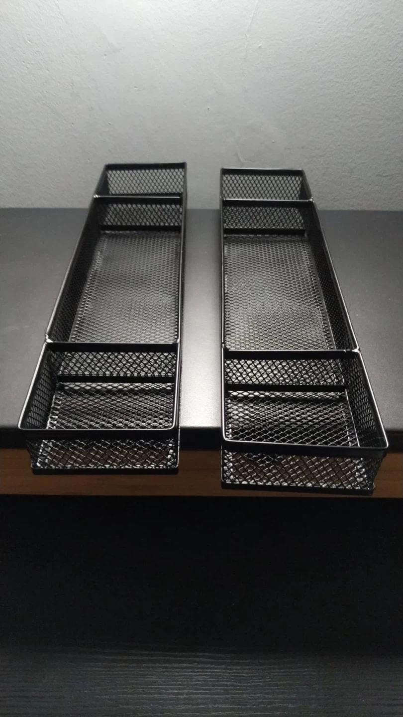 Two black mesh desk organizers are included. They're made of metal mesh and designed for organizing office supplies. These organizers are great for keeping your workspace tidy!