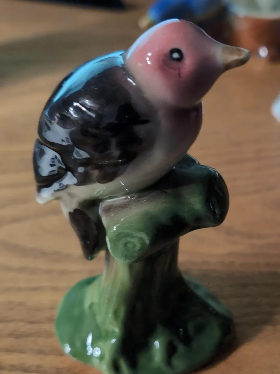 A charming vintage bird figurine, perfect for adding a touch of whimsy to your home decor. It features a lovely colour palette with a pink head, black wings, and green base. This little bird is perched on a branch, ready to bring some cheer to your space