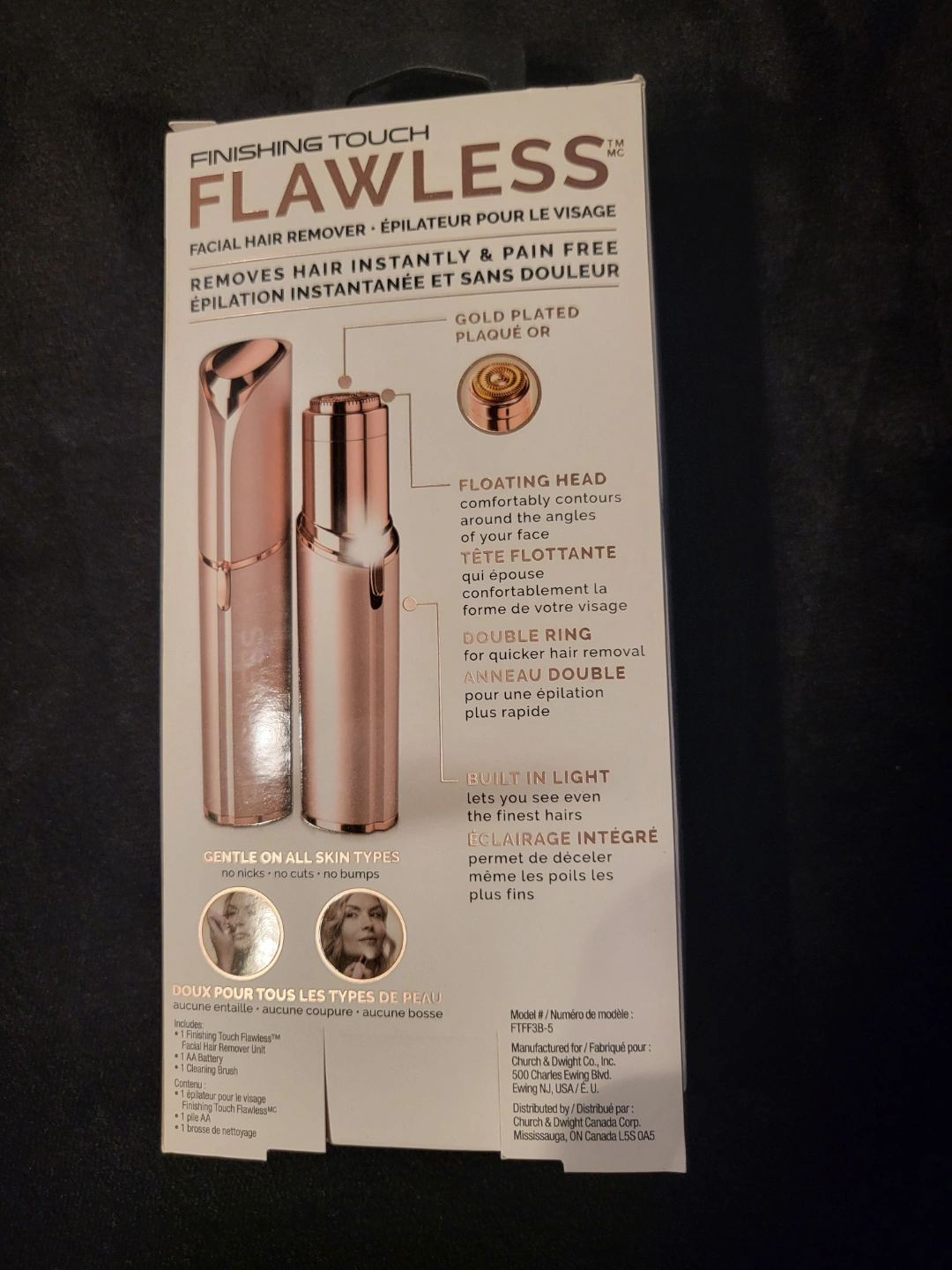 Gold-plated facial hair remover. Removes hair instantly and pain-free. Floating head follows facial contours. Gentle on all skin types. Battery included.