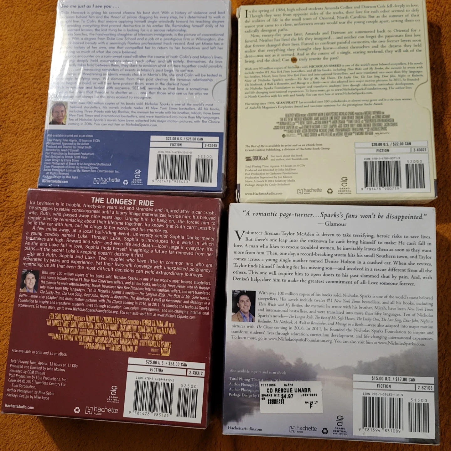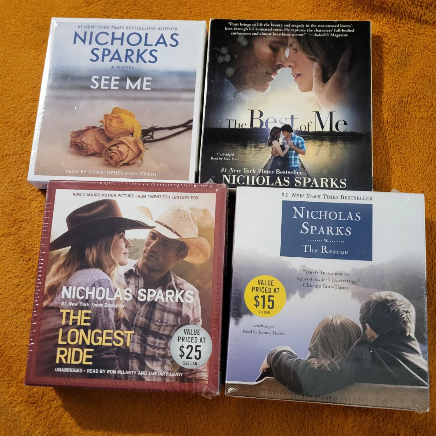 listing is four unabridged Nicholas Sparks audiobooks. Titles are The Longest Ride, The Best of Me, See Me, and The Rescue.