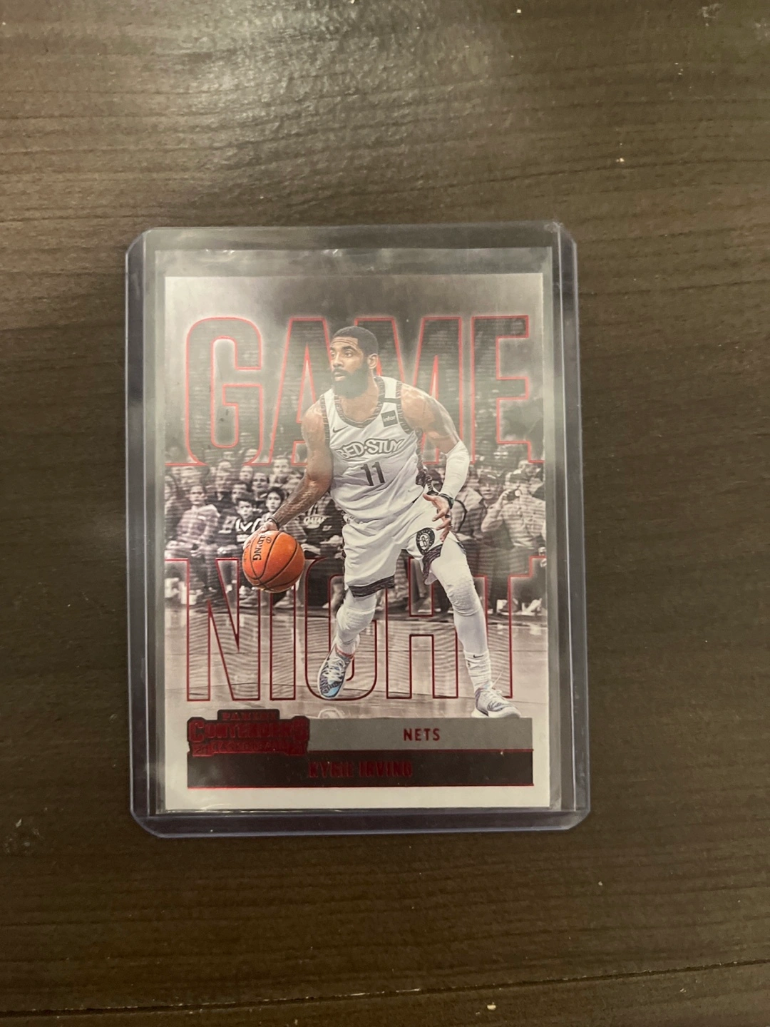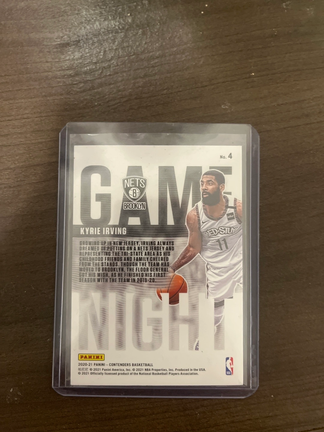 Kyrie Irving Brooklyn Nets basketball card. Part of the 1982-1986 Panini Contenders Game Night series. Card number 4.
