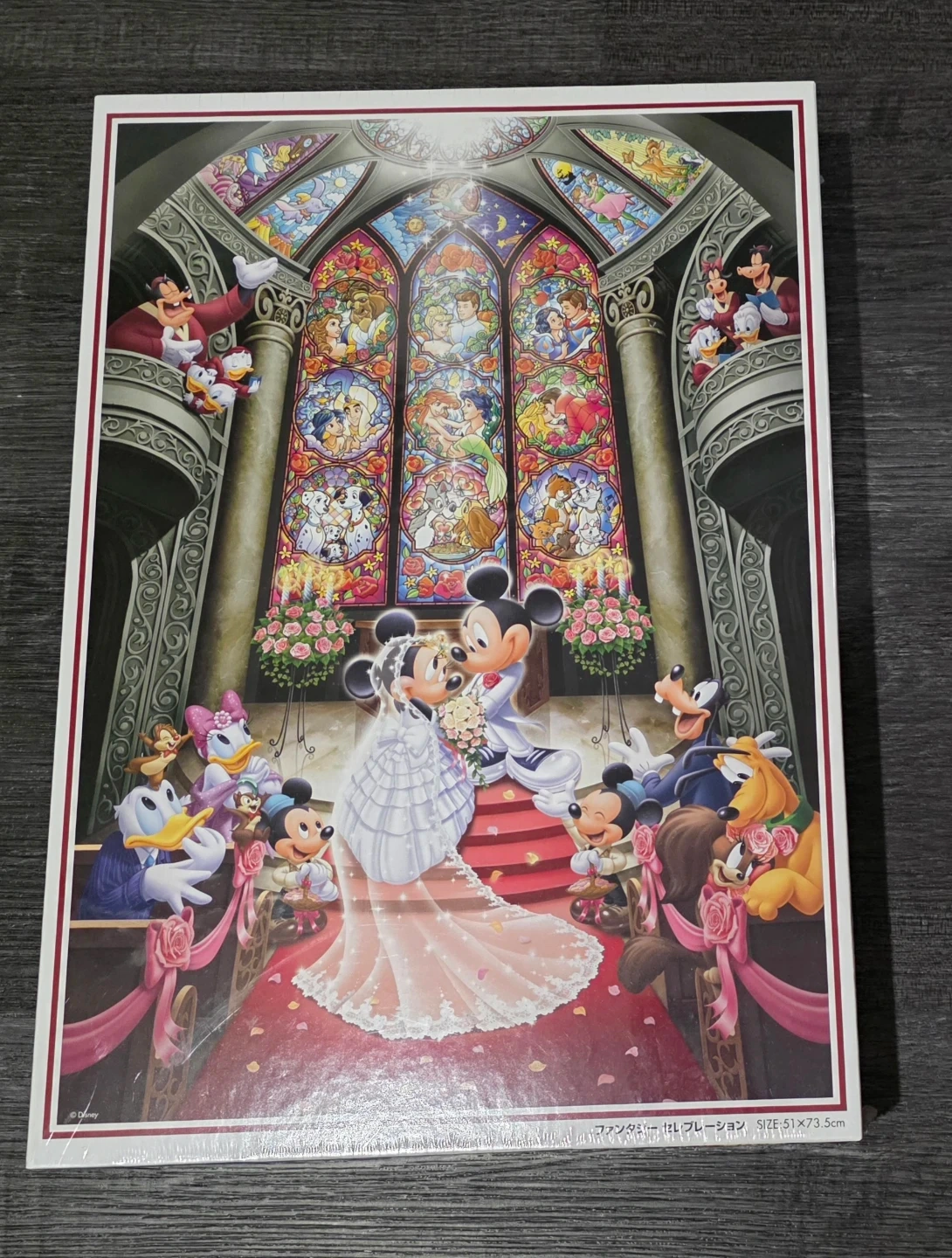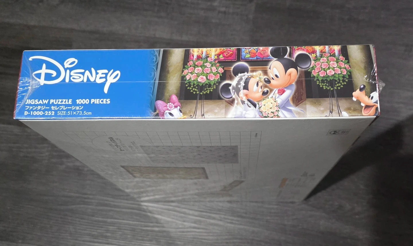 This Disney Tenyo jigsaw puzzle features Mickey and Minnie Mouse on their wedding day. It's 1000 pieces and has a size of 51x73.5cm. A fun puzzle for Disney fans!