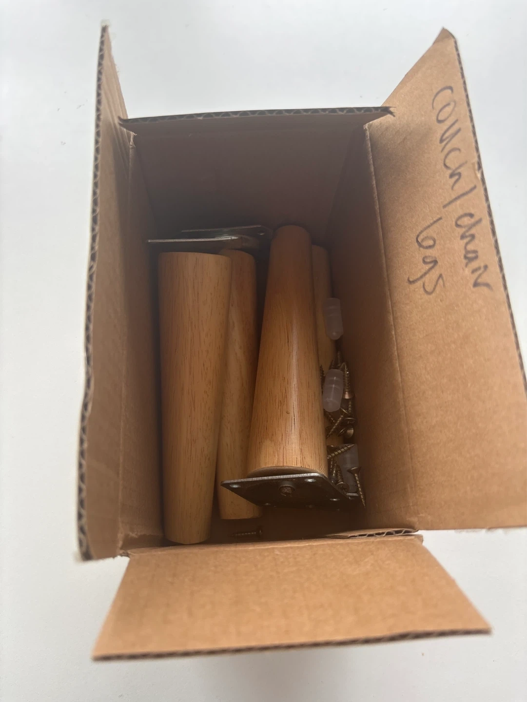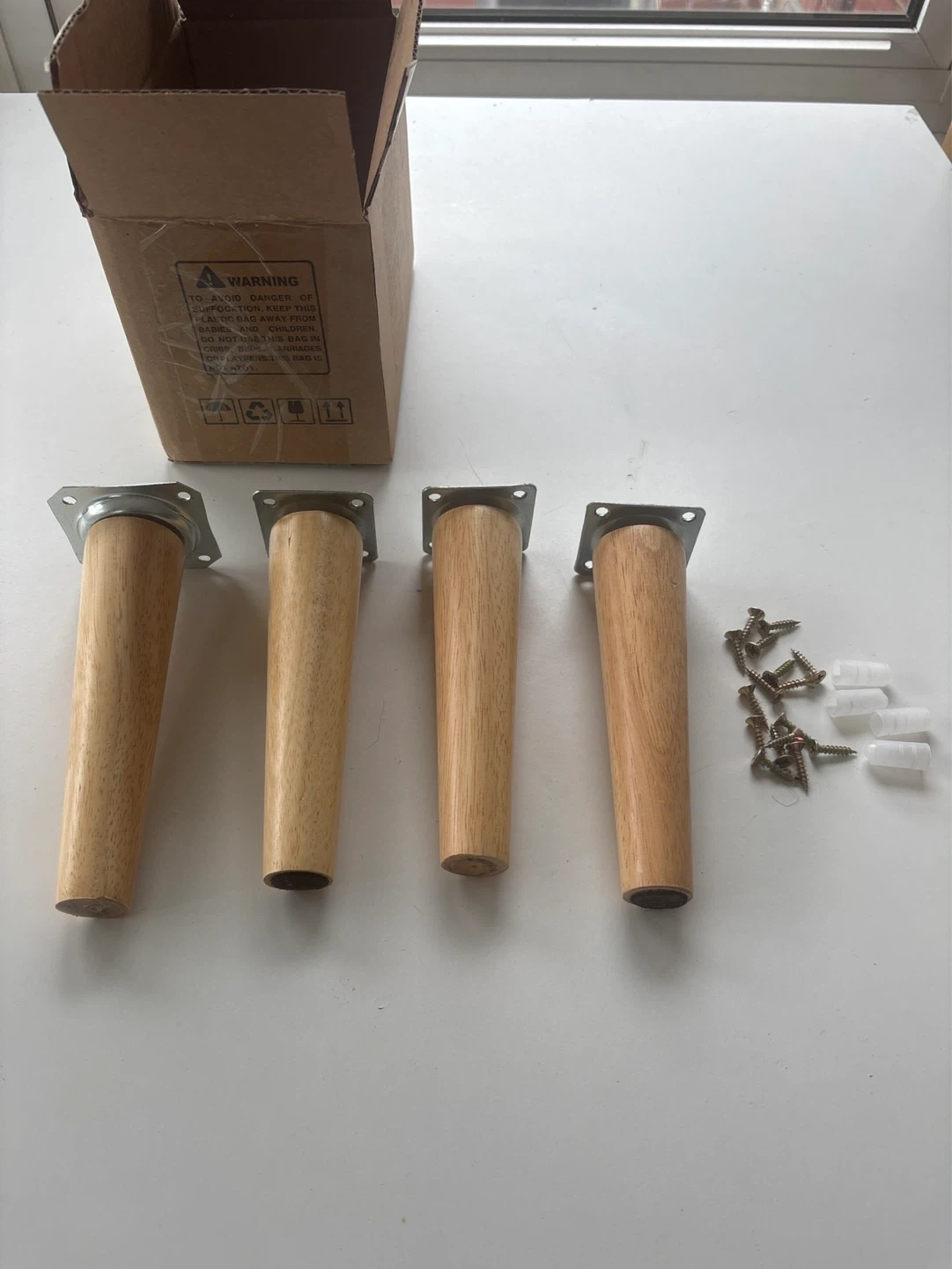 Set of four tapered wooden furniture legs. Comes with screws and wall anchors. Adds a stylish update to couches or chairs!