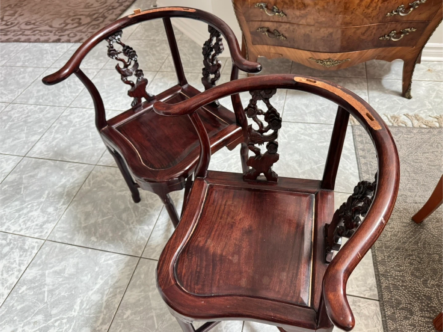 A pair of wooden corner chairs. Features curved arms and decorative carvings. Dark wood finish. These chairs are suitable for traditional living spaces. Condition as shown in photos.