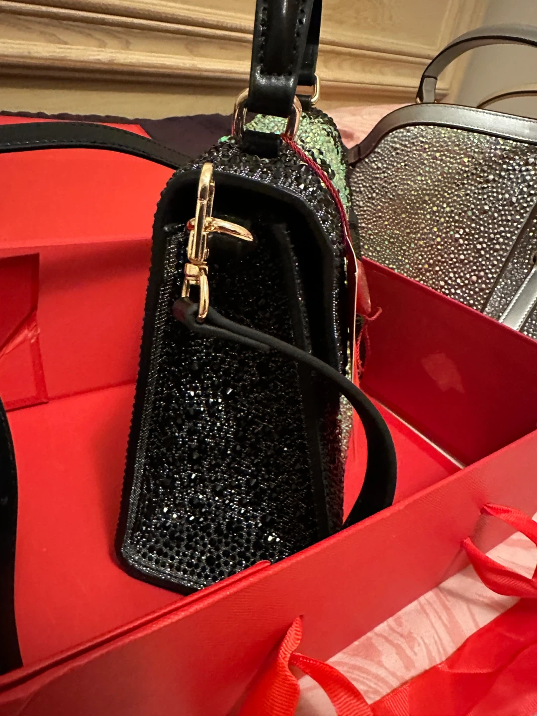 Valentino Garavani black handbag covered in crystals. Features a VLogo detail on the front and a top handle with a detachable shoulder strap. Includes original box and dust bag. Perfect for a night out or special occasion!