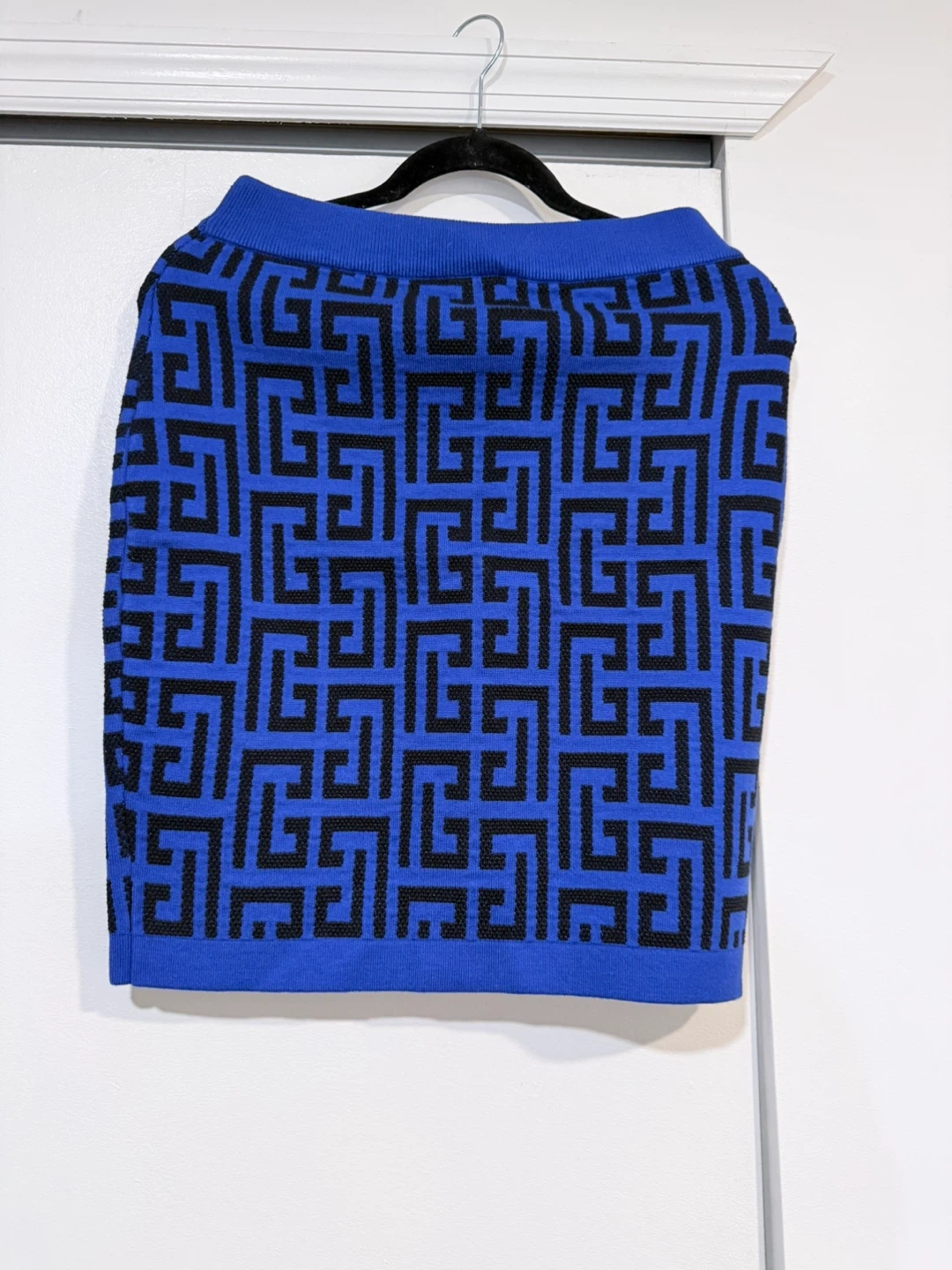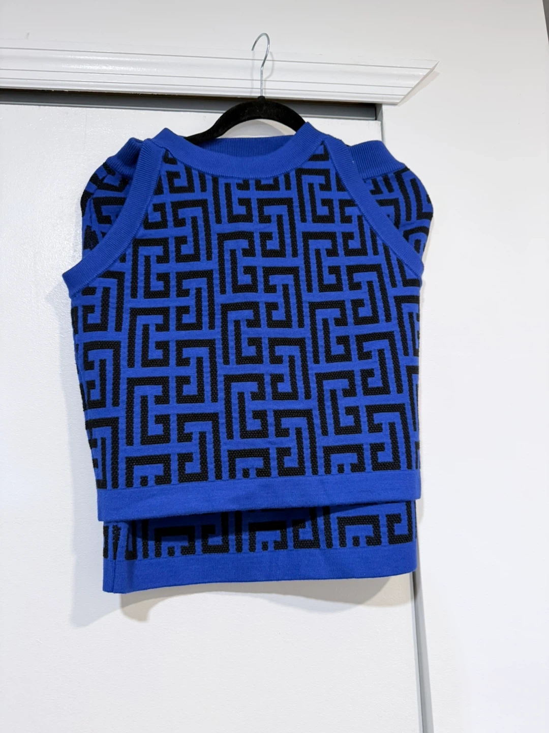 Selling a stylish Balmain knit set in a striking blue and black geometric pattern! The set includes a cardigan, a sleeveless top, and a skirt. Perfect for making a statement. Size LARGE