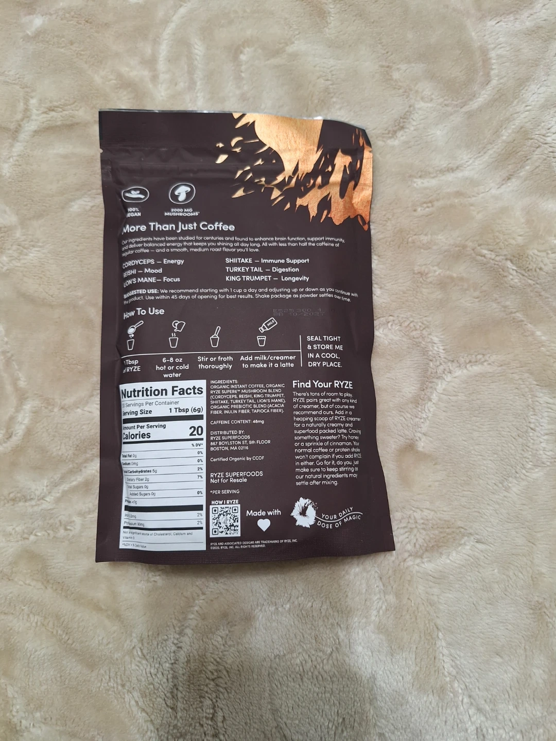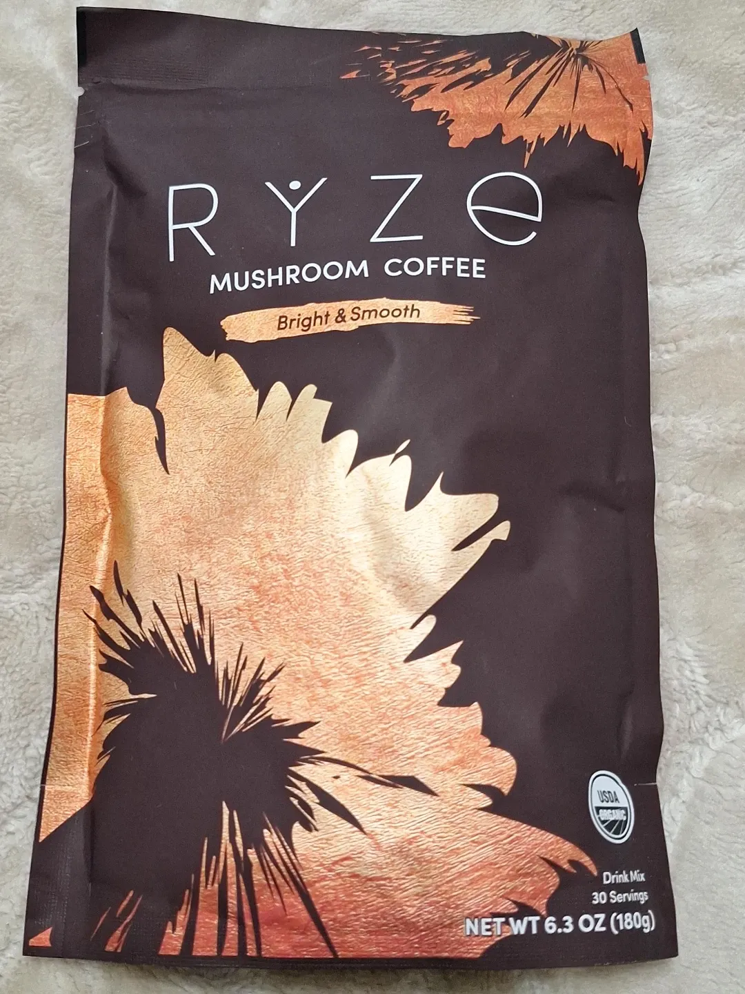 This is a bag of RYZE Mushroom Coffee Drink Mix. It's a blend of organic coffee and organic mushrooms. Each serving is 1 scoop (6g). 6 PACKS, or $10 per pack.