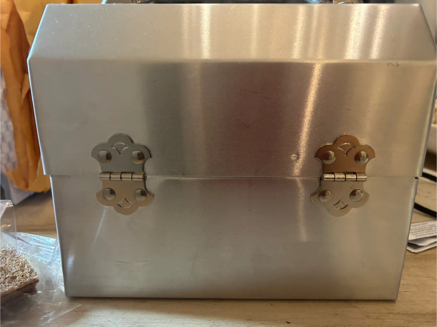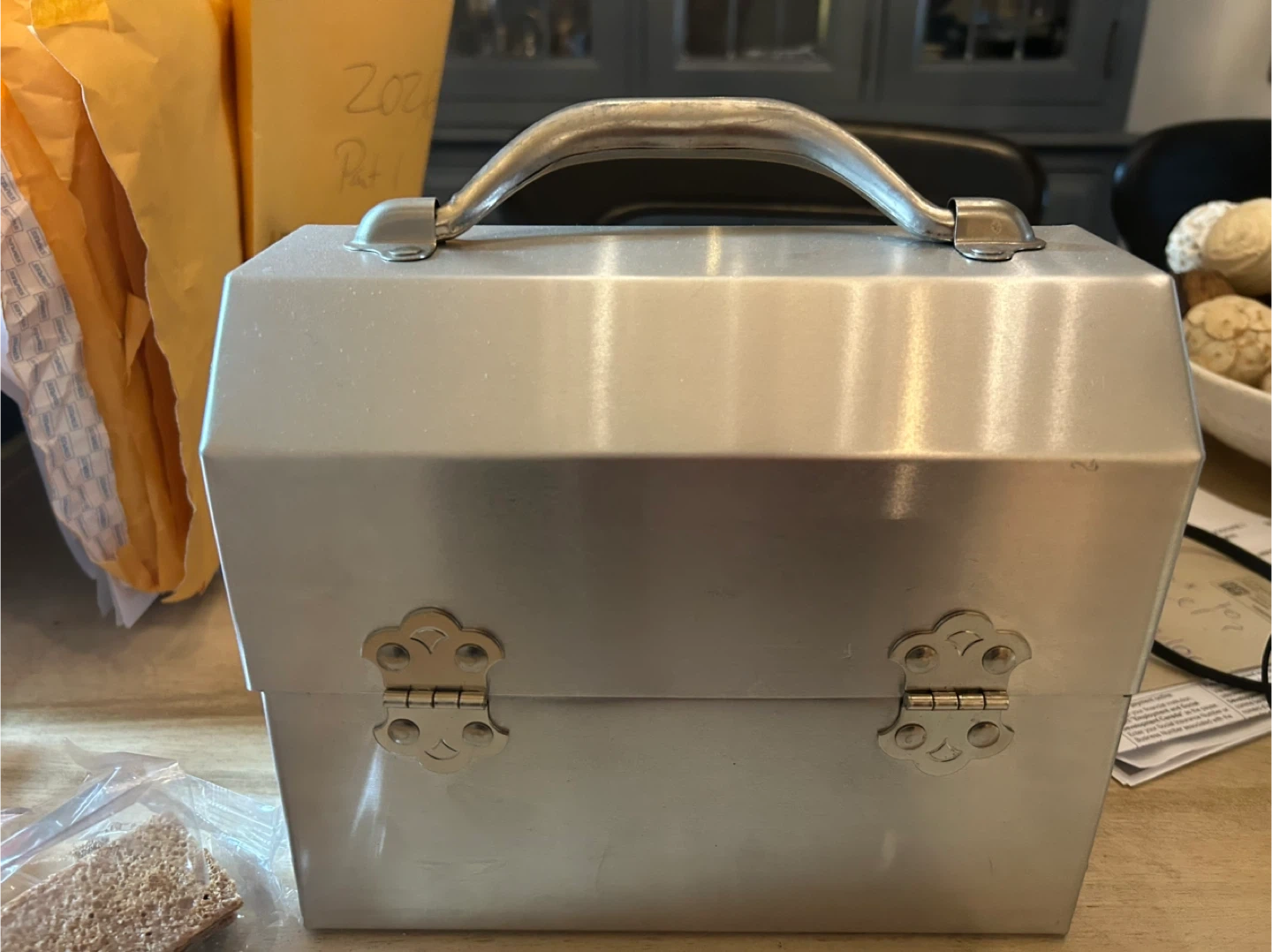 This is a handmade metal lunch box from The Miners Lunchbox Fabricators in Sudbury, Ontario. It's made of aluminum and has a classic design with two clasps. Perfect for carrying your lunch!