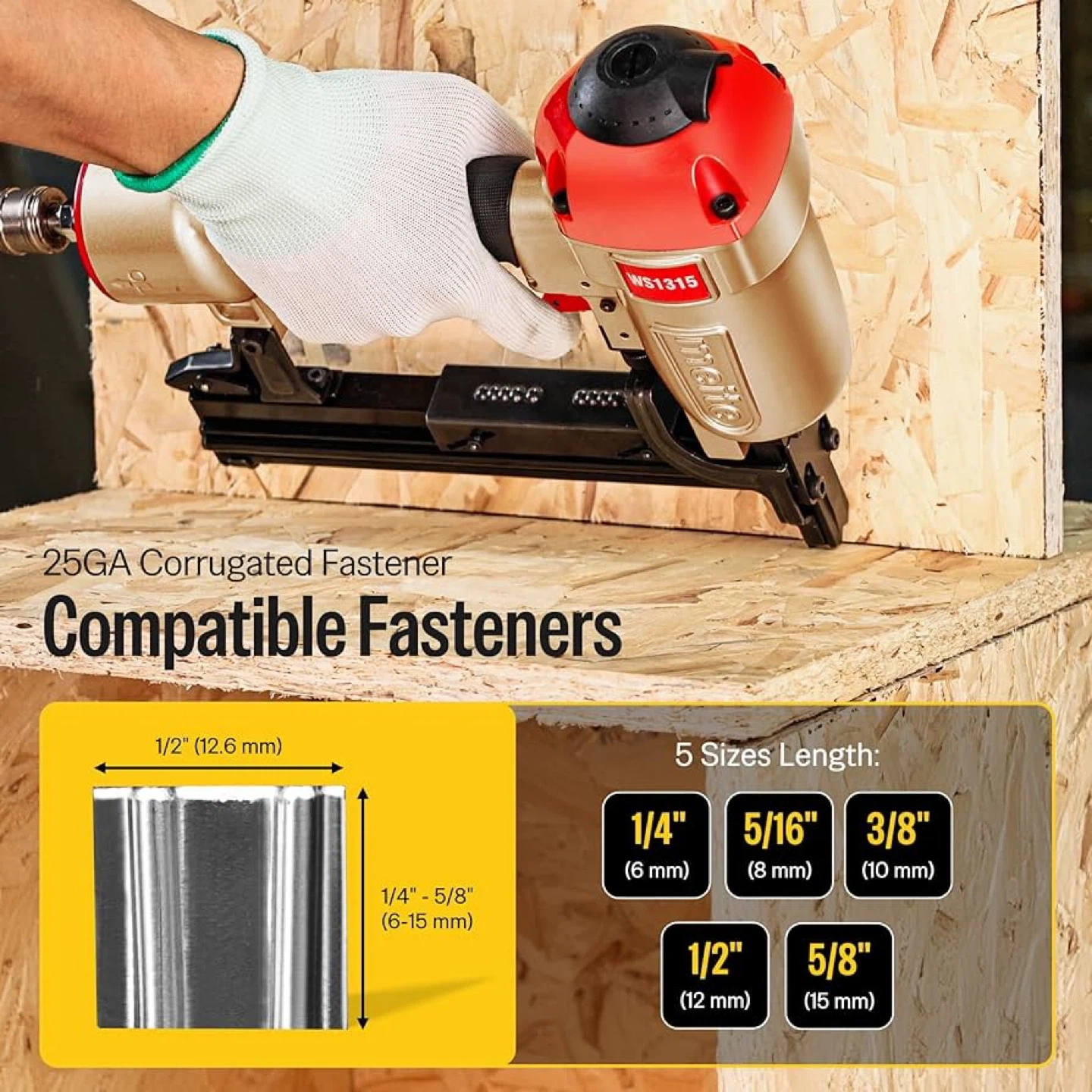 This Meite WS1315 is a pneumatic corrugated fastener tool. It accepts 1/4-inch to 5/8-inch leg lengths. Magazine capacity is 156 pcs.
