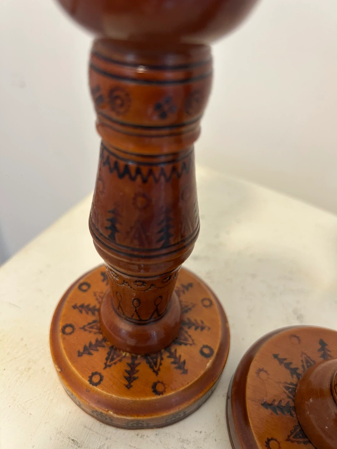 A pair of charming wooden candlesticks featuring hand-painted folk art designs. Each candlestick is finished in a warm brown tone. Perfect for adding a rustic touch to your home decor!