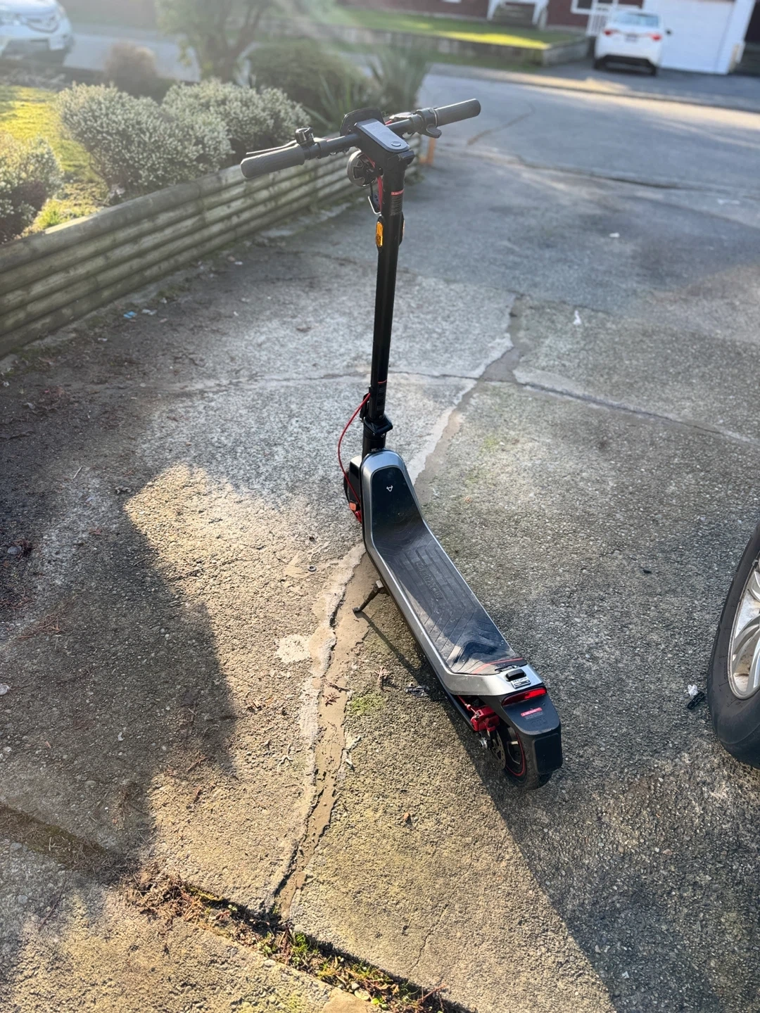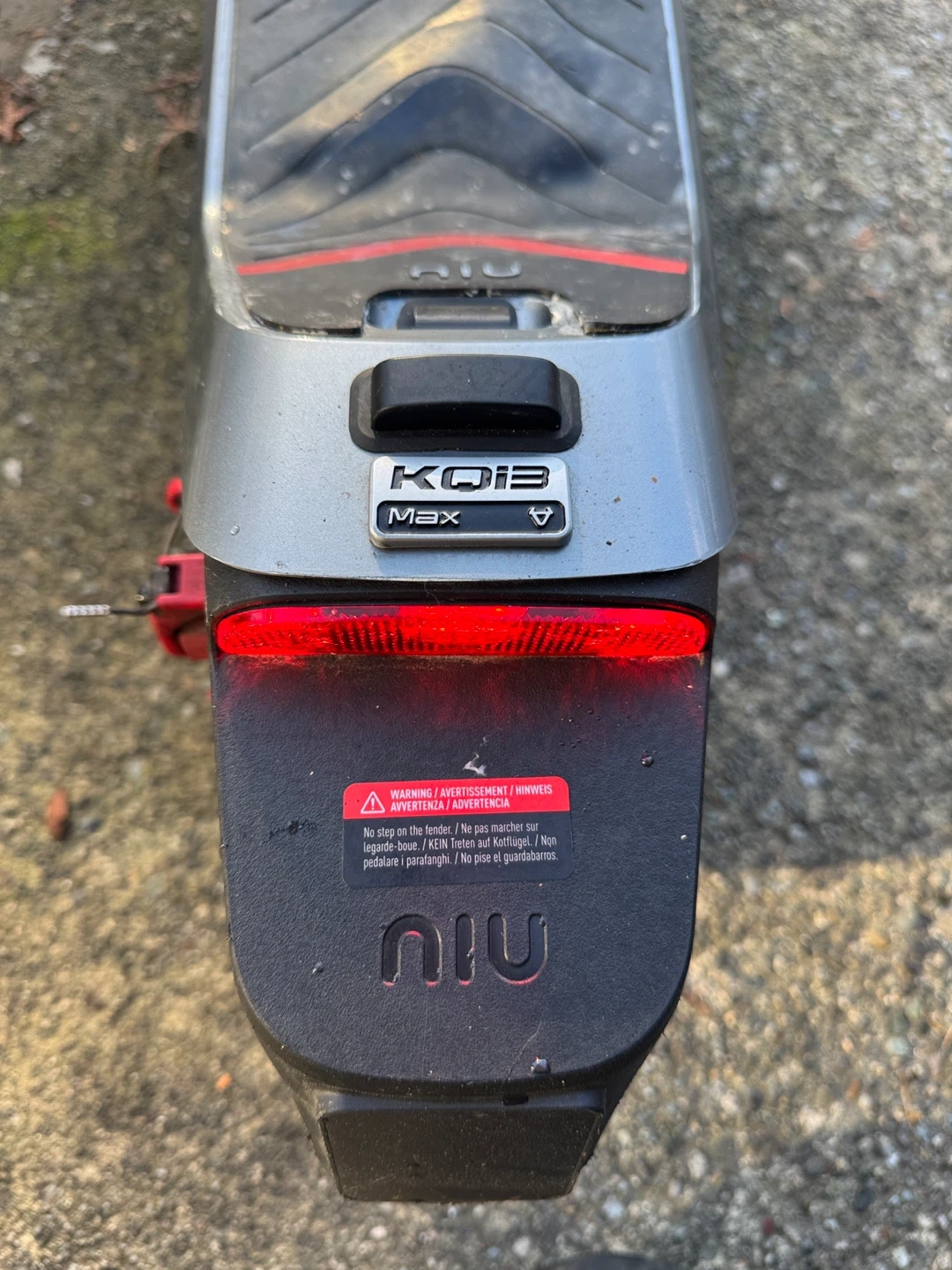 NIU KQi3 Max electric scooter in grey. It's a great way to get around town. Features a deck with grip tape and a rear brake light.