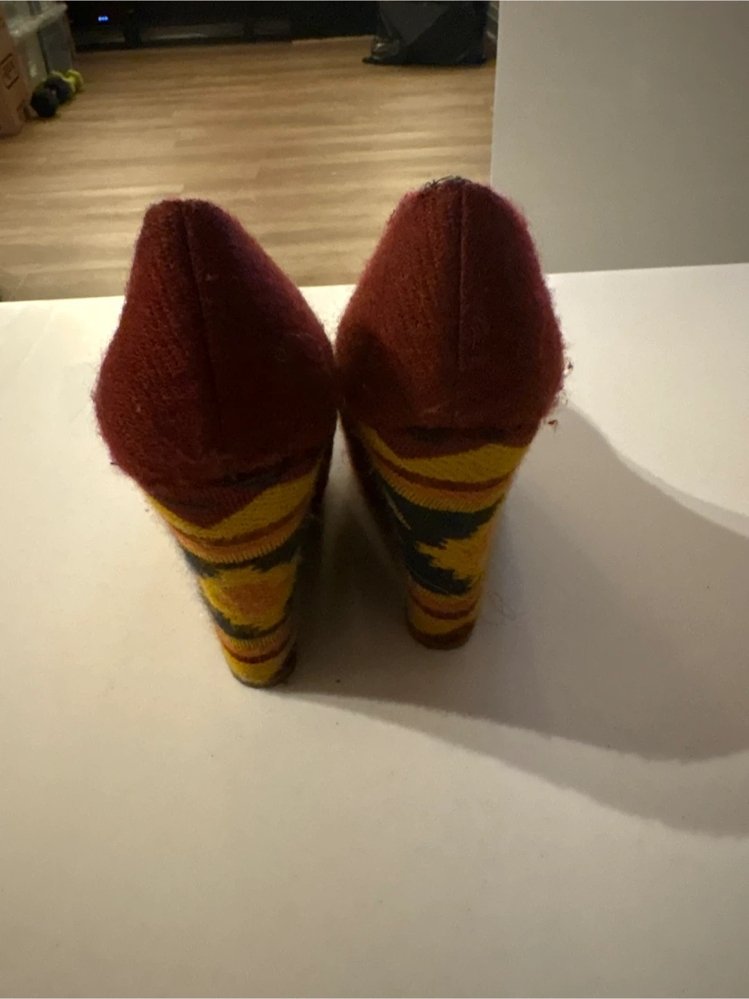 Details:• Brand: Steve Madden• Size: Women’s 8• Colour: Red / mustard / black patterned fabric• Style: Platform wedge heel• Comfortable closed-toe design