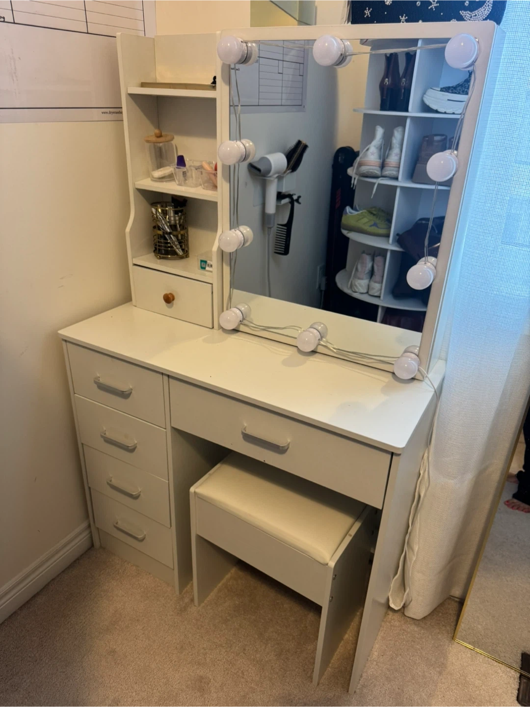 White Vanity Dressing Table with Mirror, Lights, & Stool