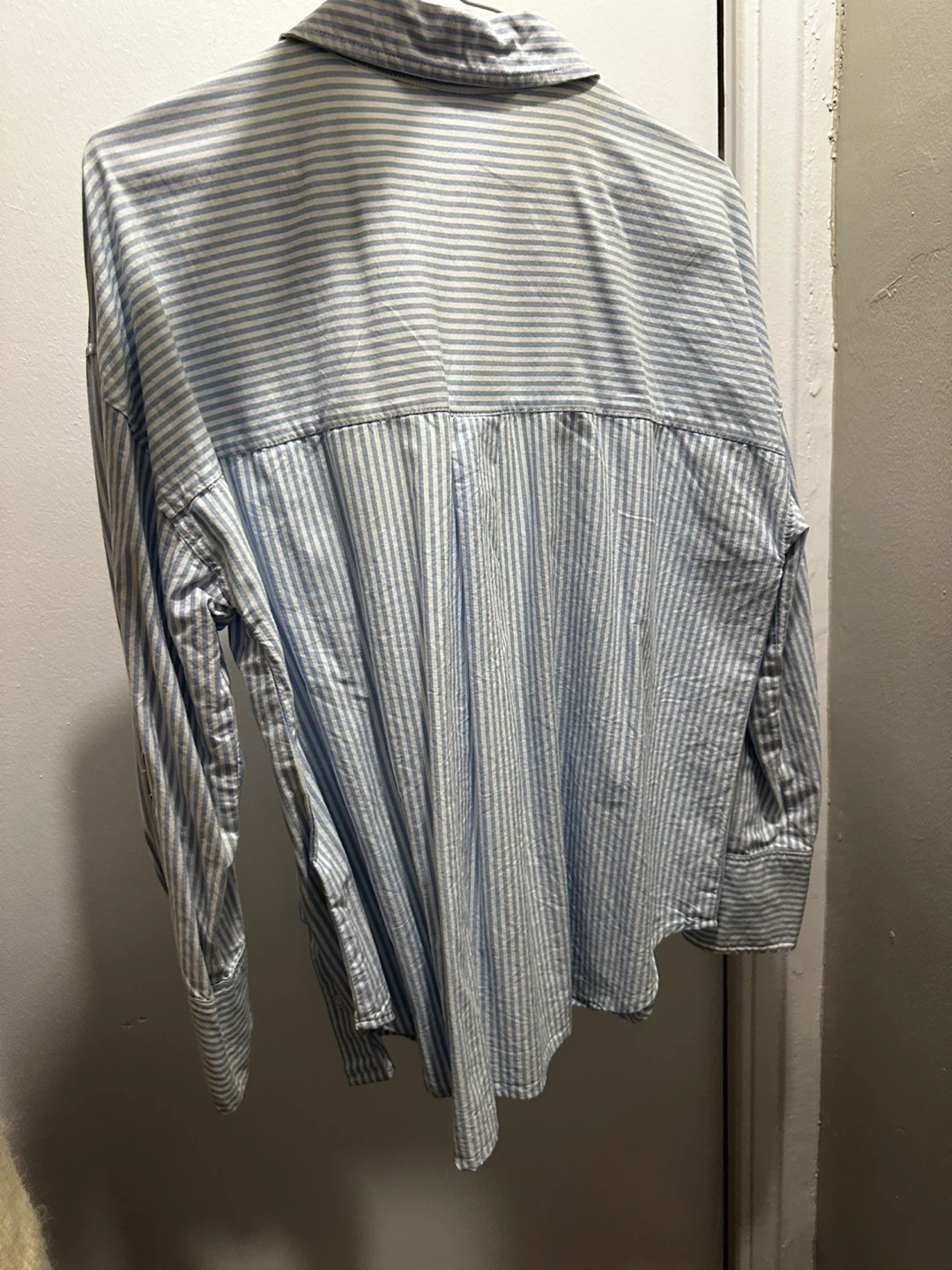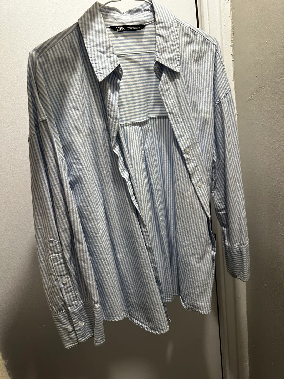Declutter. Zara striped button-up shirt. It's a size S and features a classic blue and white stripe pattern.