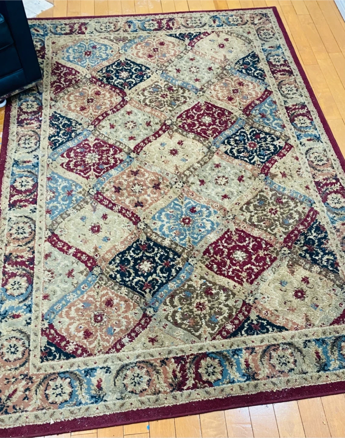 This is a lovely area rug with a colourful patterned design. It would look great in any living space!