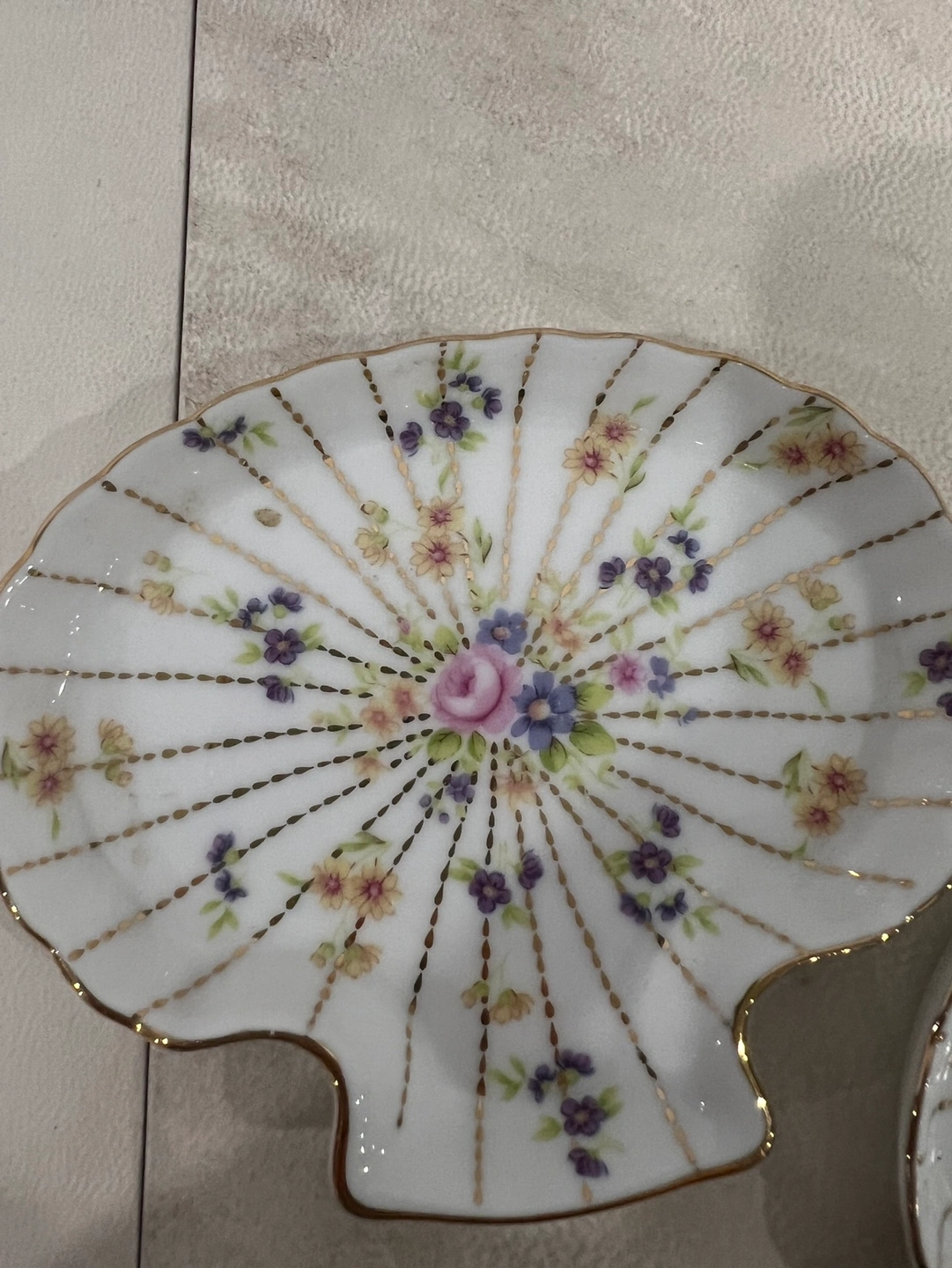 Set of 2 china dishes with beautiful flower details painted and gold trip. Perfect for displaying as a decorative piece or to keep jewellery or other small items in.