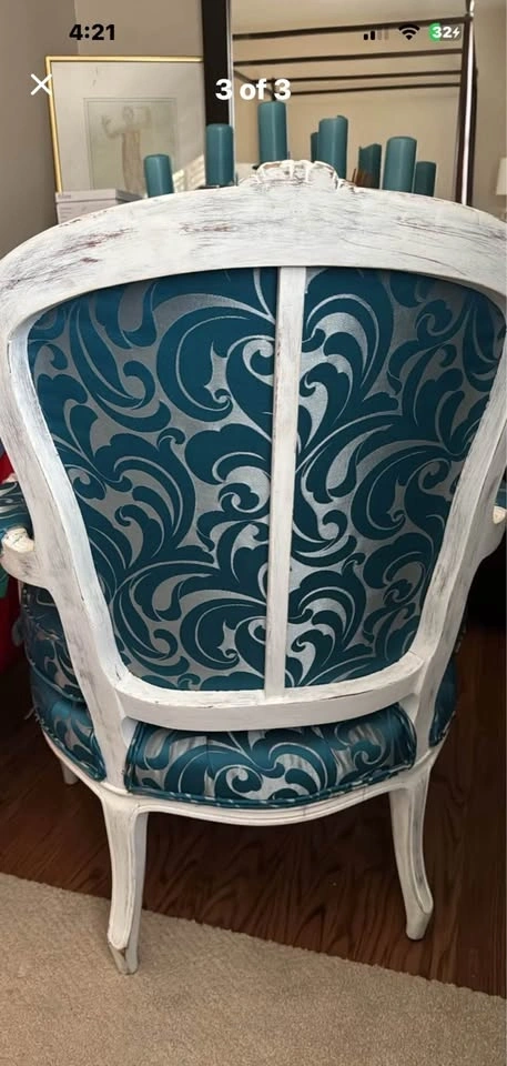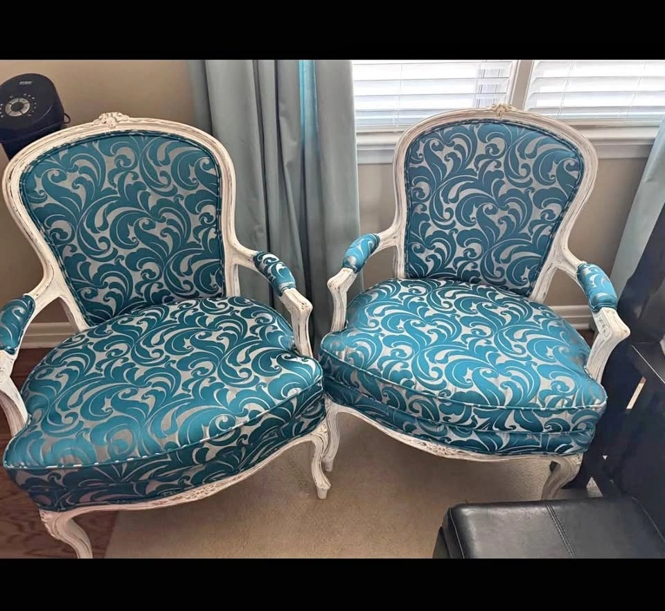 Beautiful newly upholstered armchairs with a distressed white wood frame and turquoise damask-style fabric. Solid, comfortable, and perfect as statement pieces for a living room, bedroom, sitting area, or office. Sturdy and comfortable. Sold individually or as a pair. Pick up only Victoria Village.