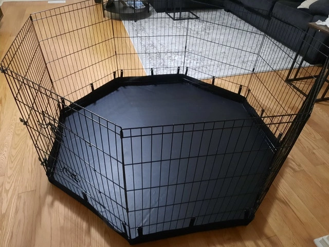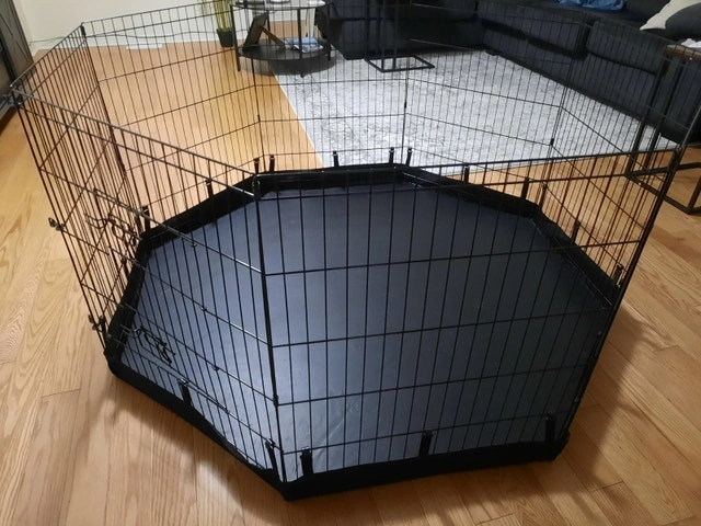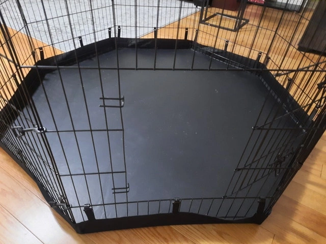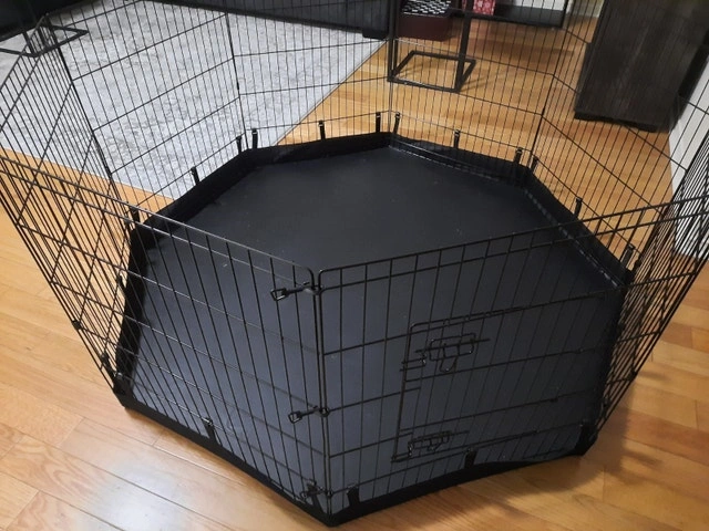 8 panels Foldable Metal Dog Exercise Pen with Bottom Pad, 24" H. Suitable for indoor or outdoor use for small to medium pets. Let me know if you're interested!