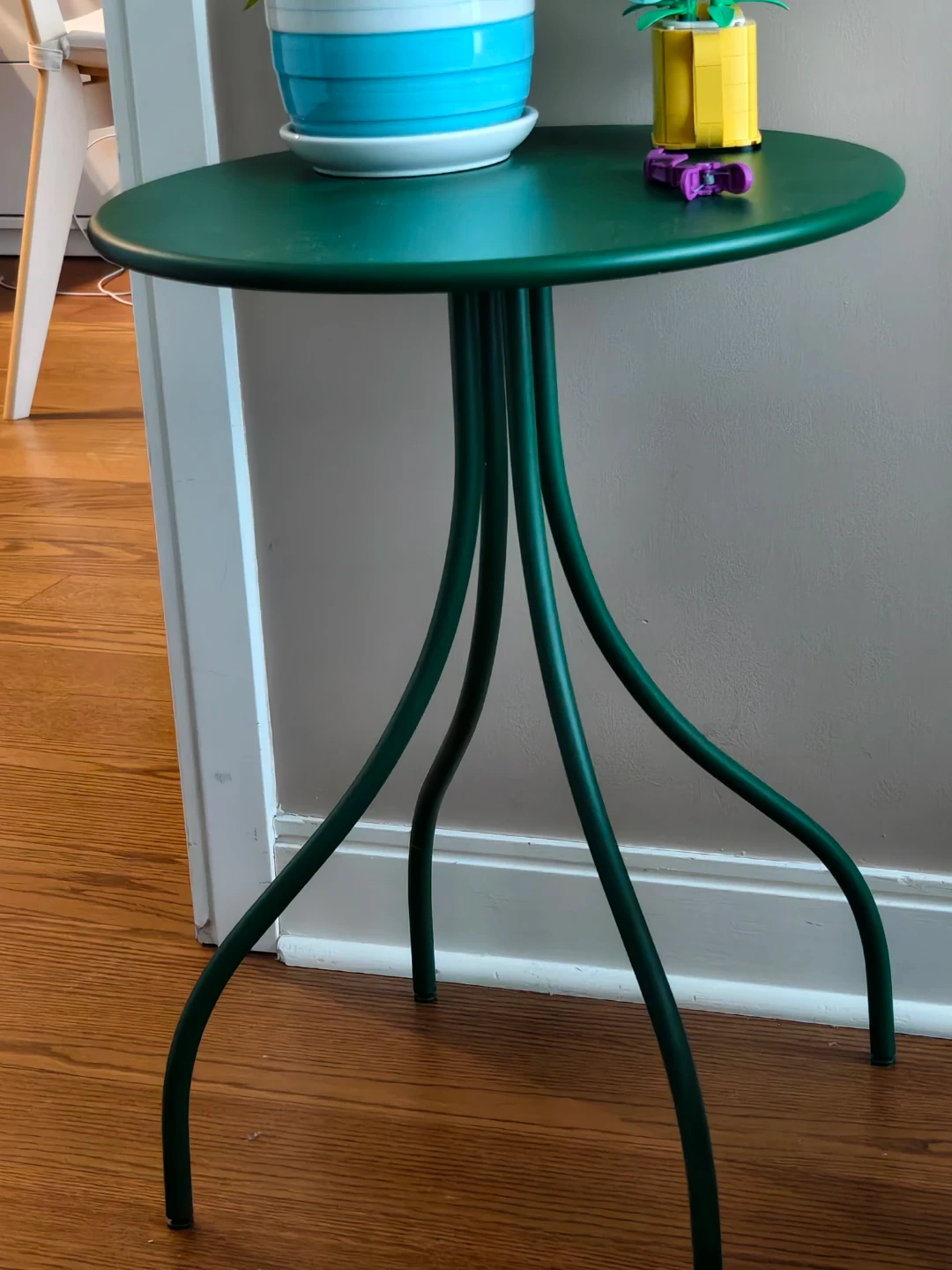 A stylish green round side table with unique curved legs. This table's metal construction makes it durable. It's perfect for holding a plant or a few small items.