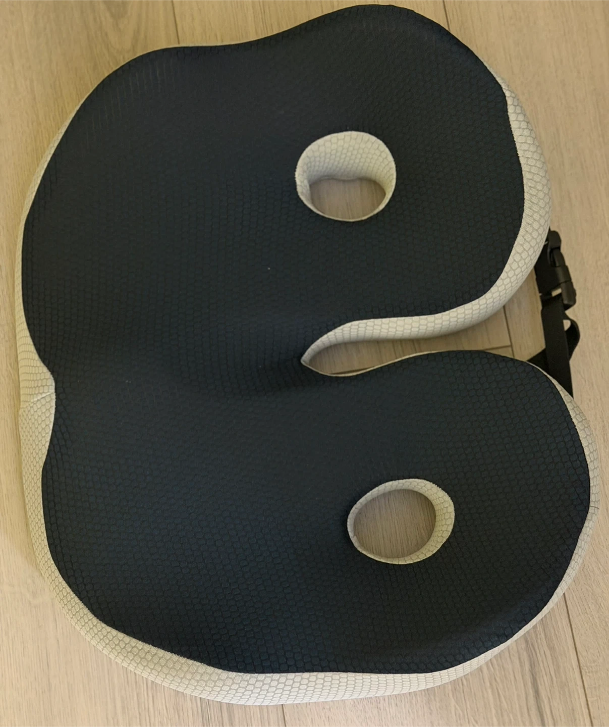 This is a dark blue and light grey ergonomic seat cushion. It's designed to provide comfortable seating. It features cutouts for pressure relief.