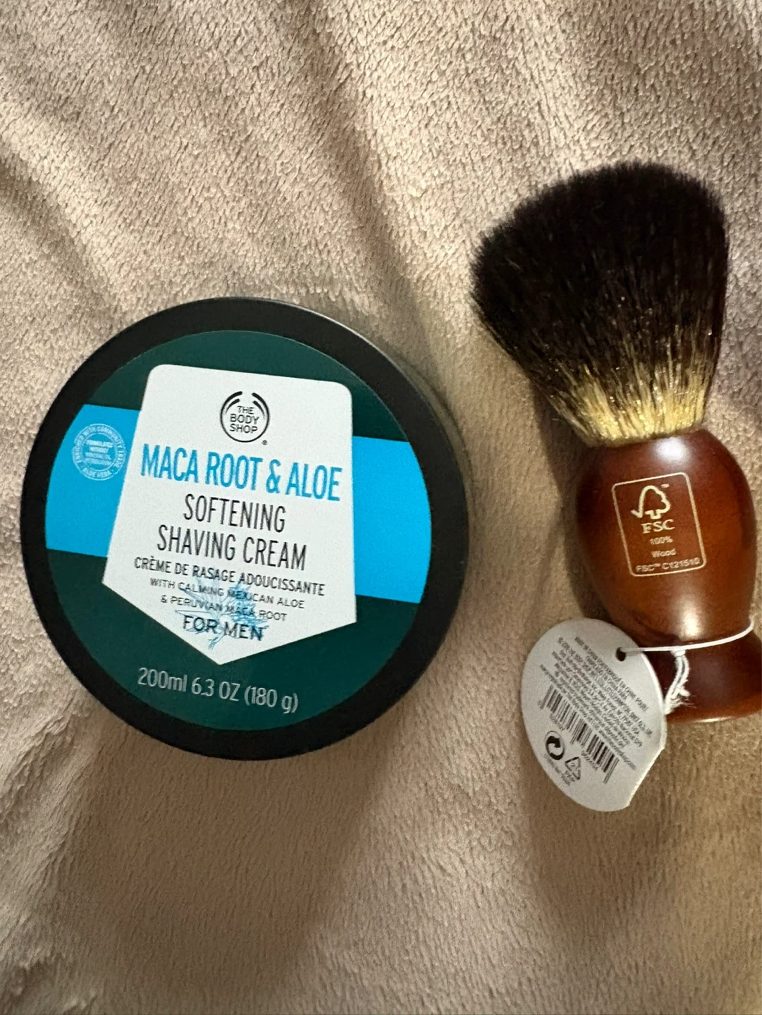 New -The Body Shop Maca Root & Aloe Softening Shaving Cream for Men. The cream comes in a 200ml container. A wooden shaving brush with FSC. The items are presented in a cork-style pouch from The Body Shop.
