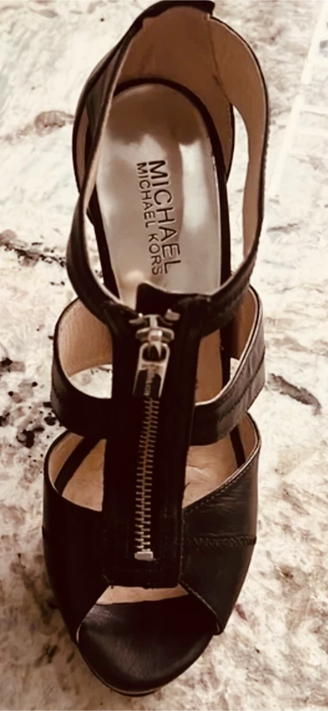 Stylish Michael Kors heels in black. These open-toe heels feature a front zipper and ankle strap. Crafted from leather with a comfortable insole. Perfect for adding a chic touch to any outfit! They are very comfortable in great condition.