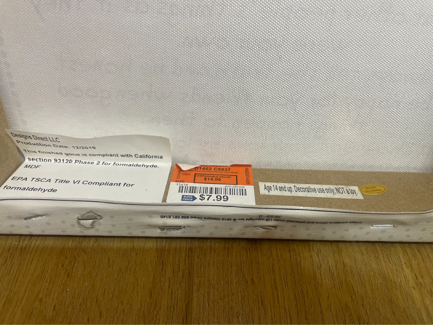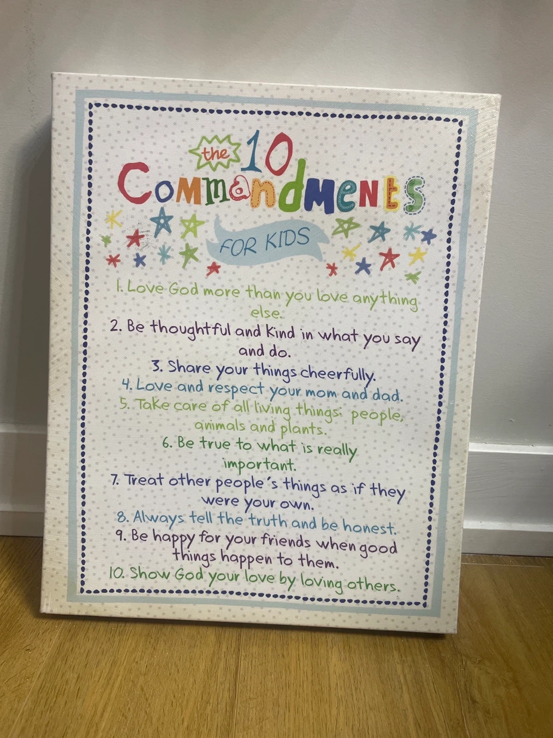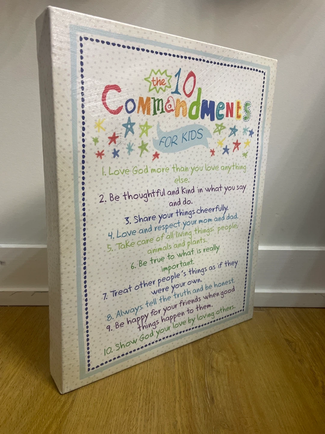 This canvas art features the 10 Commandments for kids in a colourful design. It's made from MDF and is compliant with California section 9312D Phase 2 for formaldehyde. Decorative use only, not a toy.