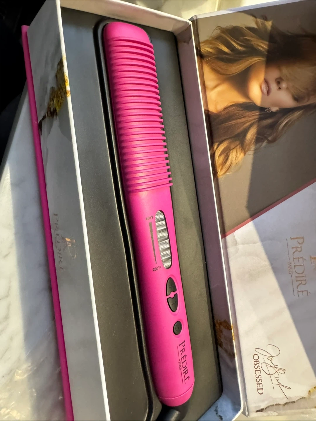Selling a PREDIRE Paris hair straightening brush in pink! It comes with the box. It heats up from 250°F to 400°F. Great for quick and easy styling