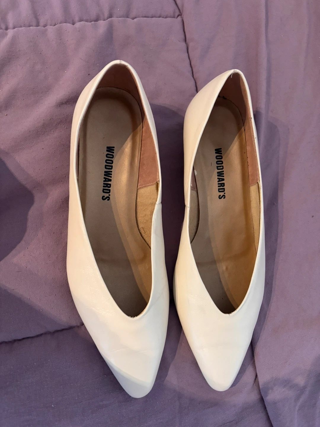 Woodward's women's cream pointed-toe flats. These shoes are a size 9. They feature a v-shaped neckline and a low heel.