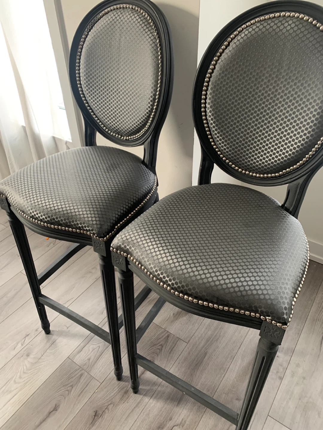 Selling a set of two stylish bar stools. They feature a classic oval backrest and comfortable seat upholstered in a textured dark grey fabric, accented with silver nailhead trim. The wooden frames are painted black with elegant carved details. These stools would look great in a kitchen island or home bar setting!