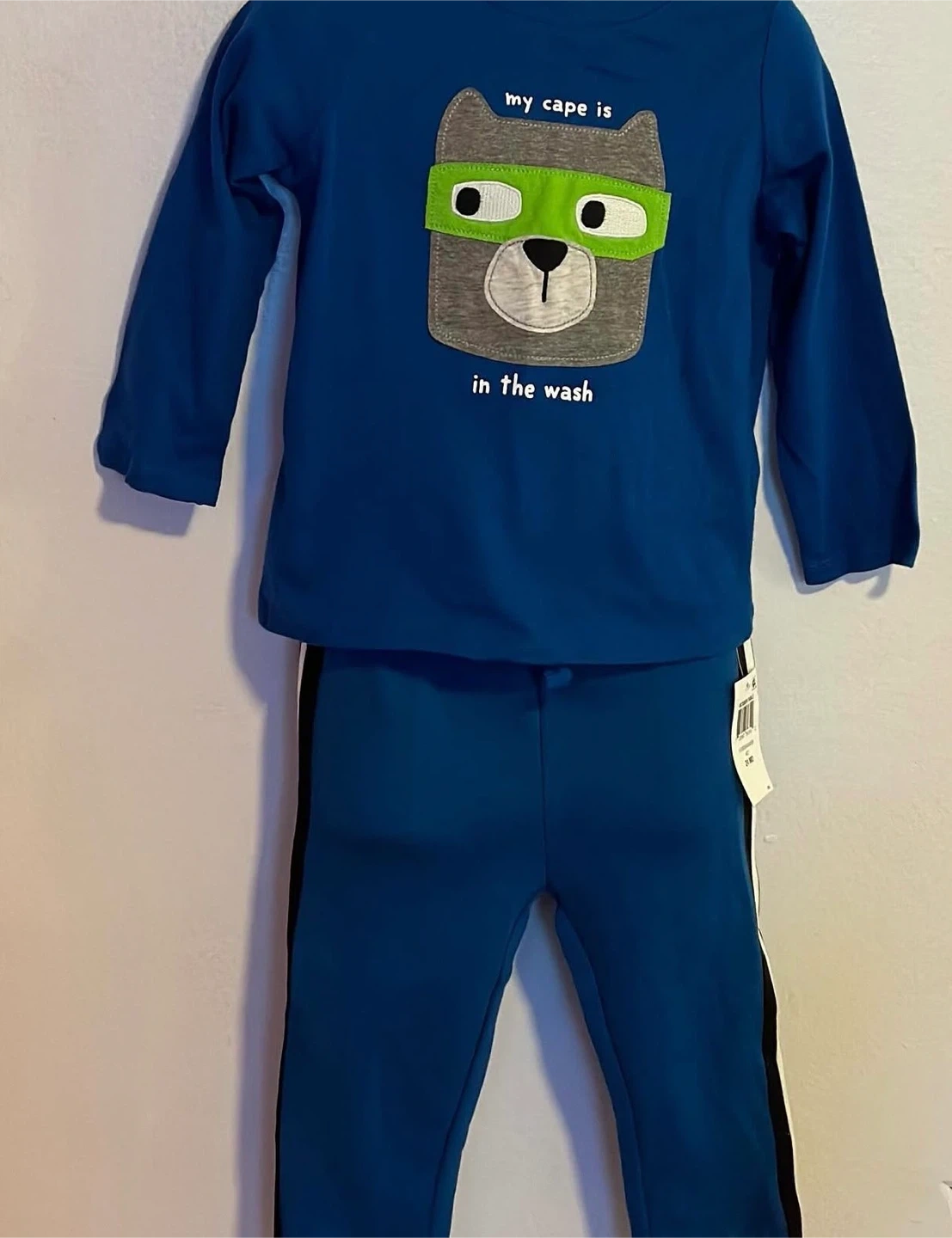 Cute Carter's long-sleeve shirt and pants set for kids. The shirt features a graphic of a bear with the text "my cape is in the wash". Pants have a drawstring waist and a black stripe down the side. Made from a soft cotton blend.