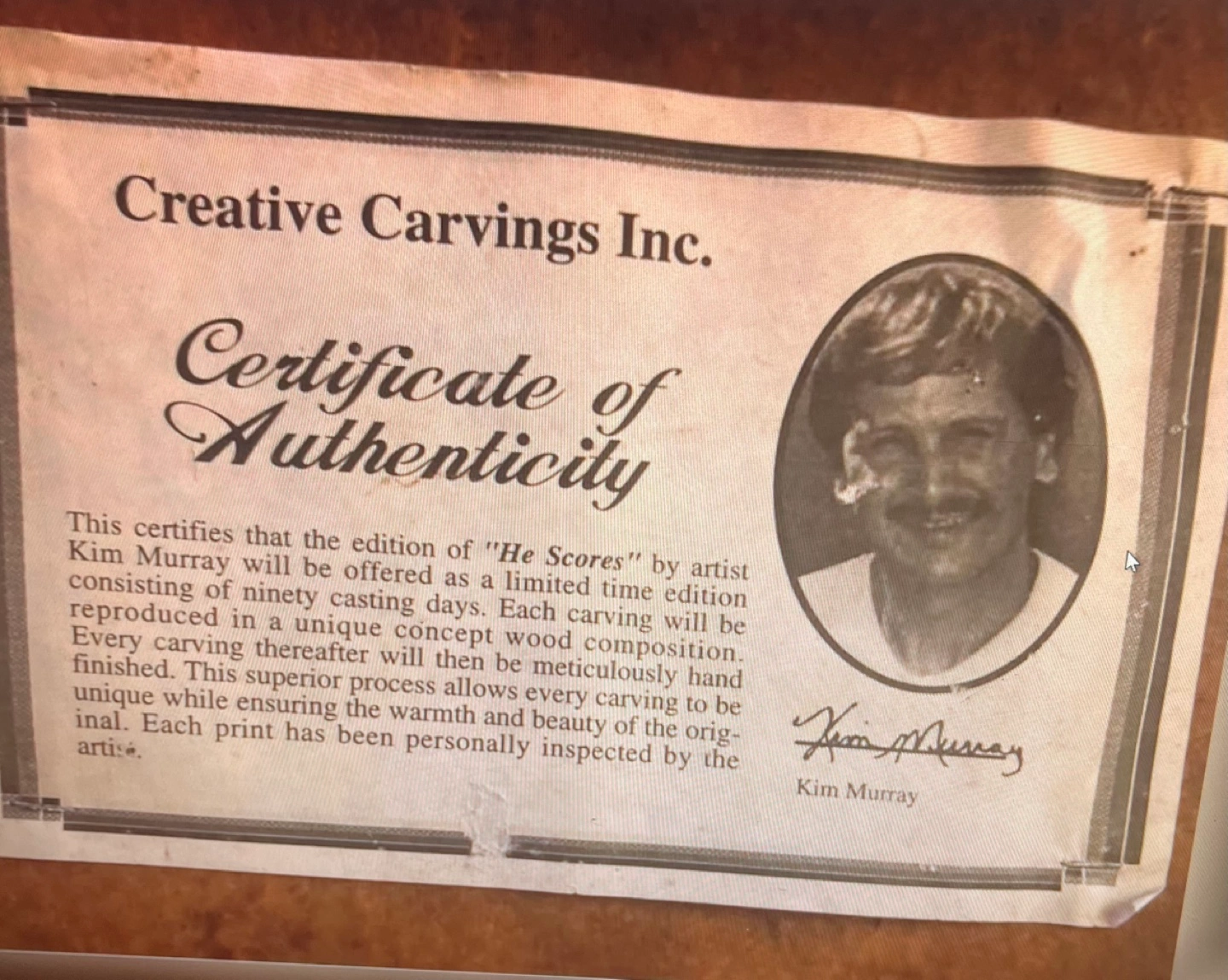 Kim Murray's "He Scores" Limited Edition Hockey Wood Carving