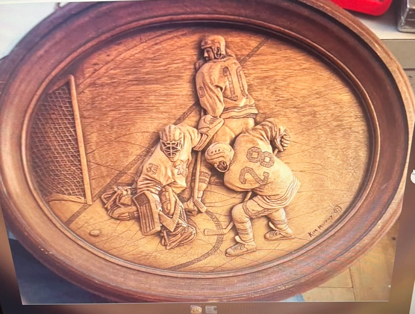 Limited edition wood carving. Depicts hockey players. Comes with certificate of authenticity. Numbered edition of ninety. Unique piece. Hand finished. Beautiful detail.