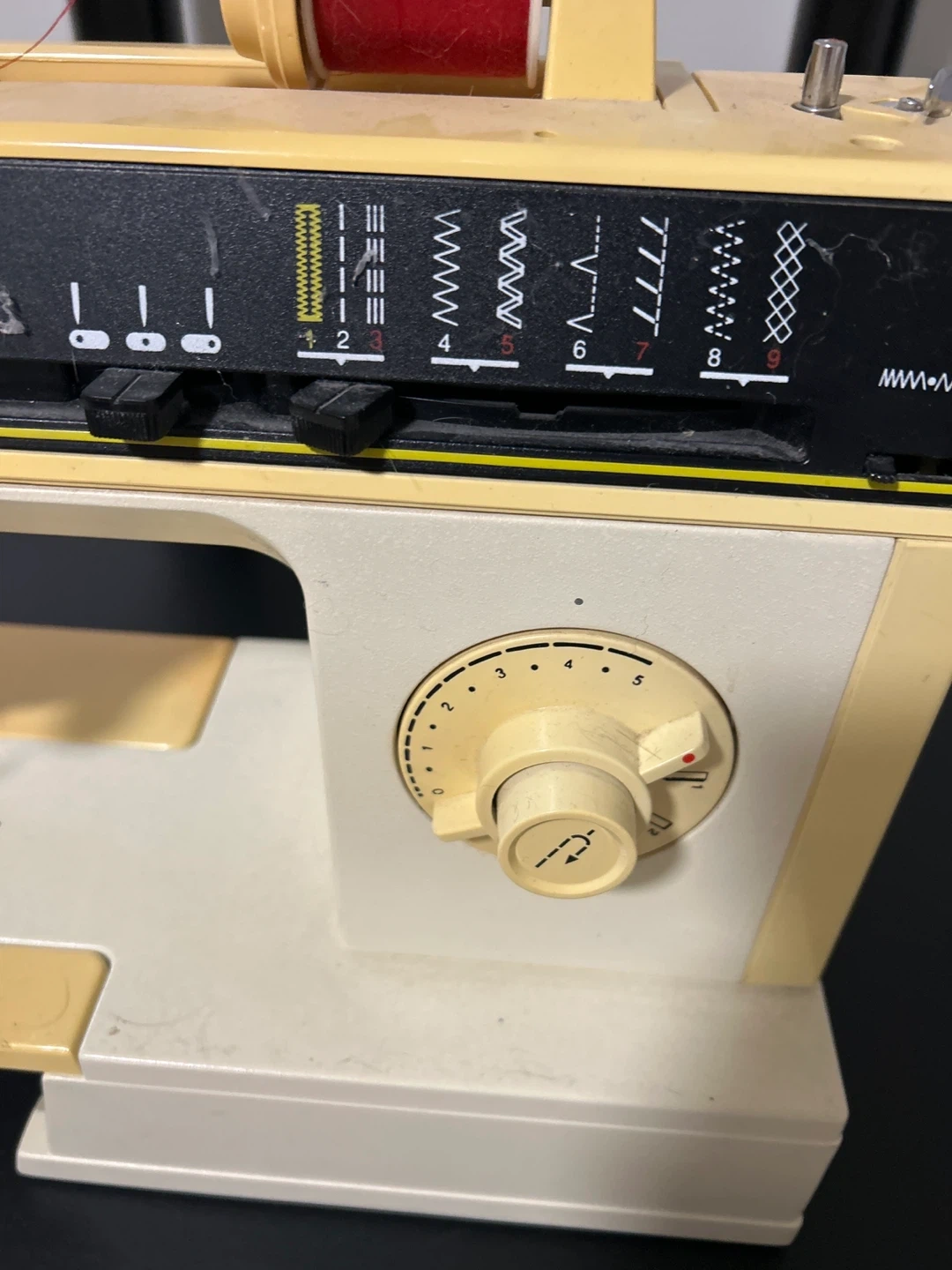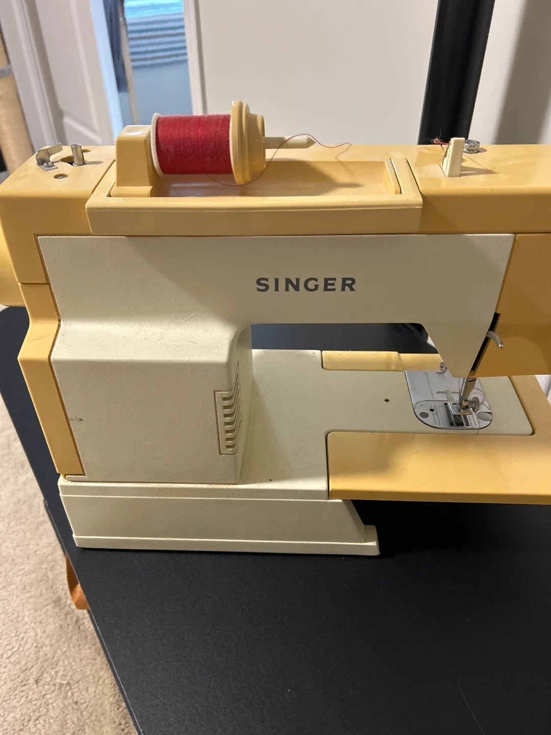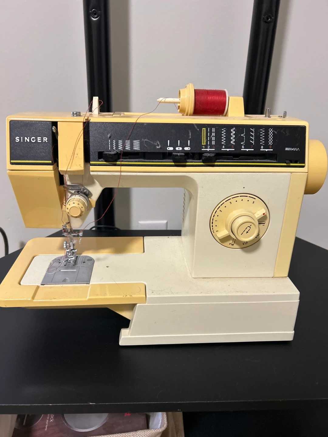 This is a vintage Singer sewing machine. It's yellow and cream coloured. Comesthread. It has multiple stitch patterns available for different sewing needs.