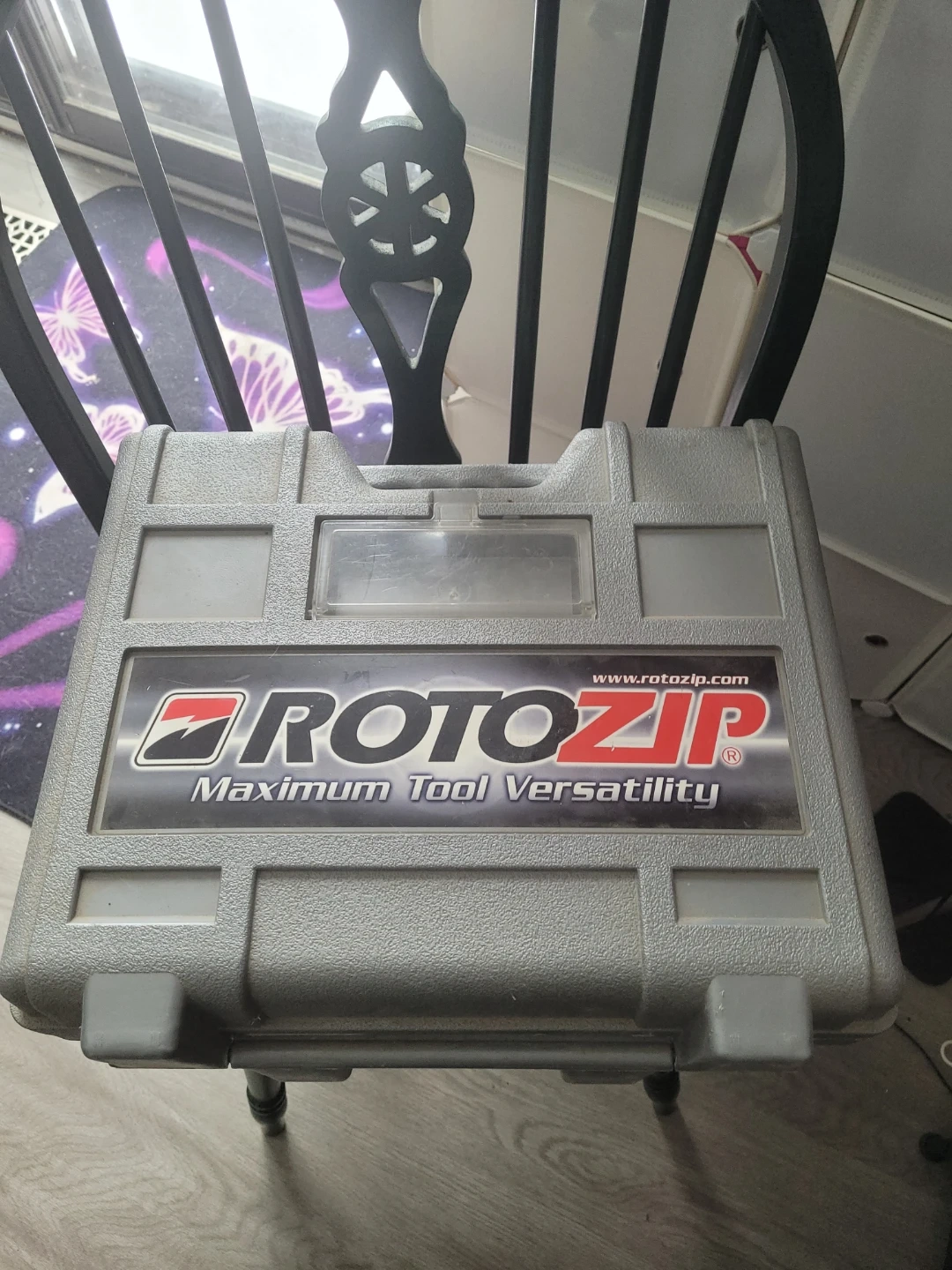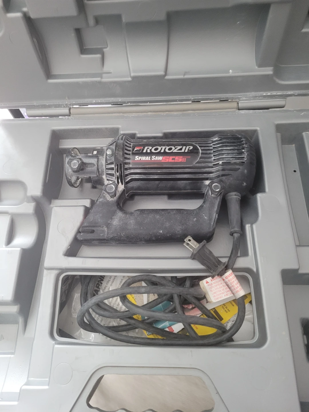 This RotoZip Spiral Saw is model SCS V. It's in a carrying case with the power cord. This tool's designed for maximum versatility in cutting applications.