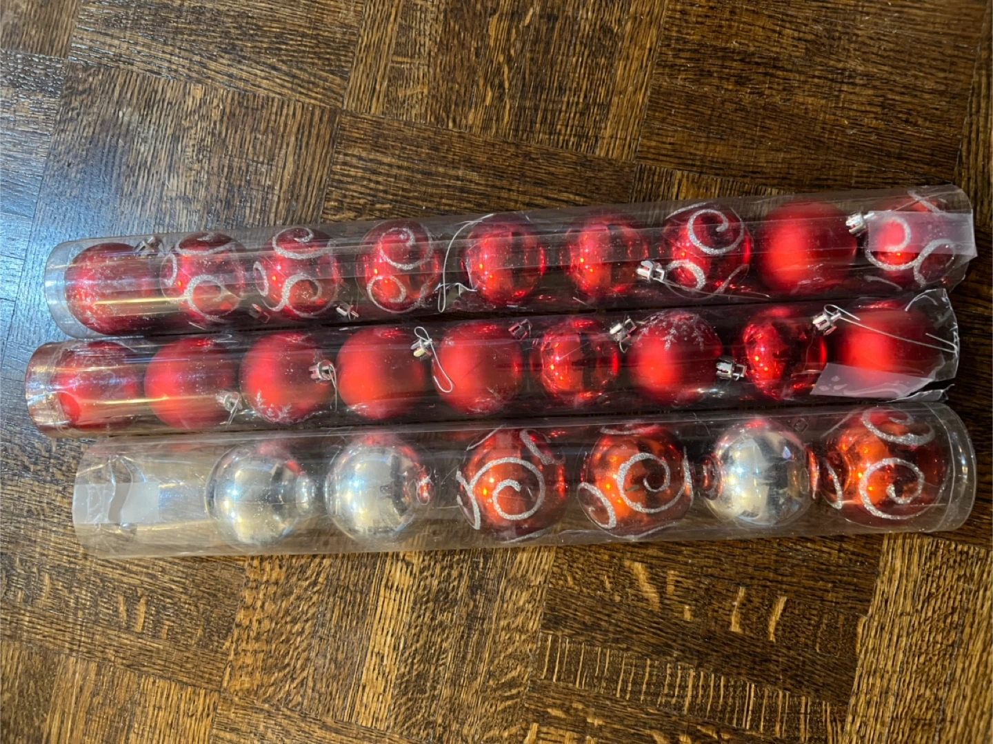 Set of Christmas tree ornaments in red and silver. Features a festive swirl design. Comes in a convenient clear plastic tube for storage. Perfect for adding holiday cheer to your tree!