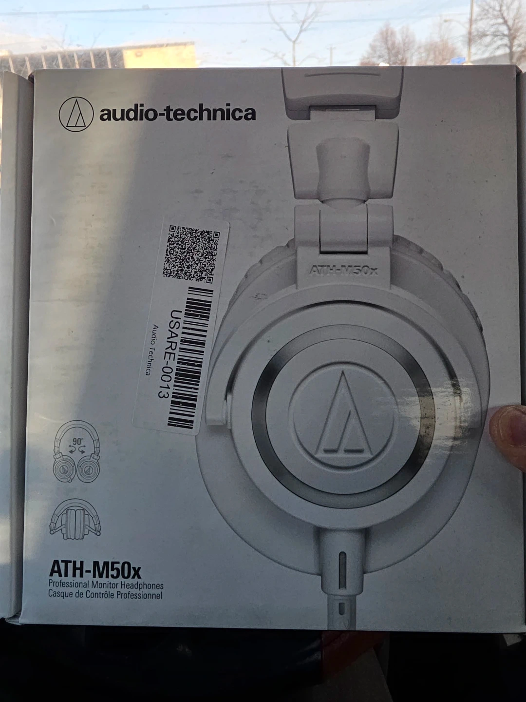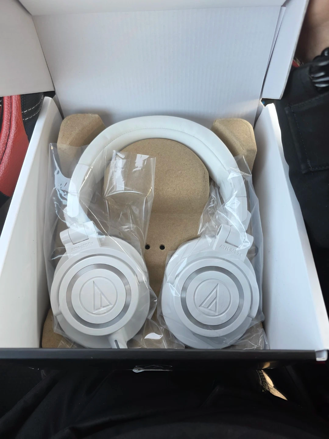 Professional monitor headphones from Audio-Technica. These ATH-M50x headphones offer excellent audio quality. They come in a clean white colour and are in their original packaging.