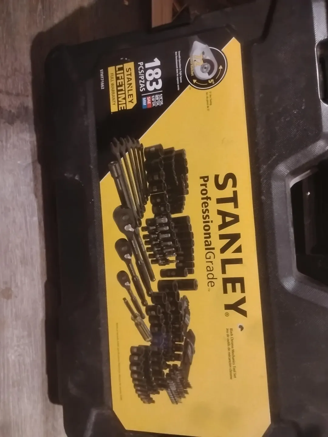 This is a Stanley 183 piece Professional Grade Mechanics Tool Set. It features black chrome finish. Includes 1/4", 3/8", and 1/2" drive sizes.