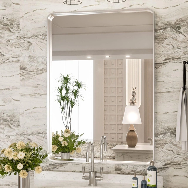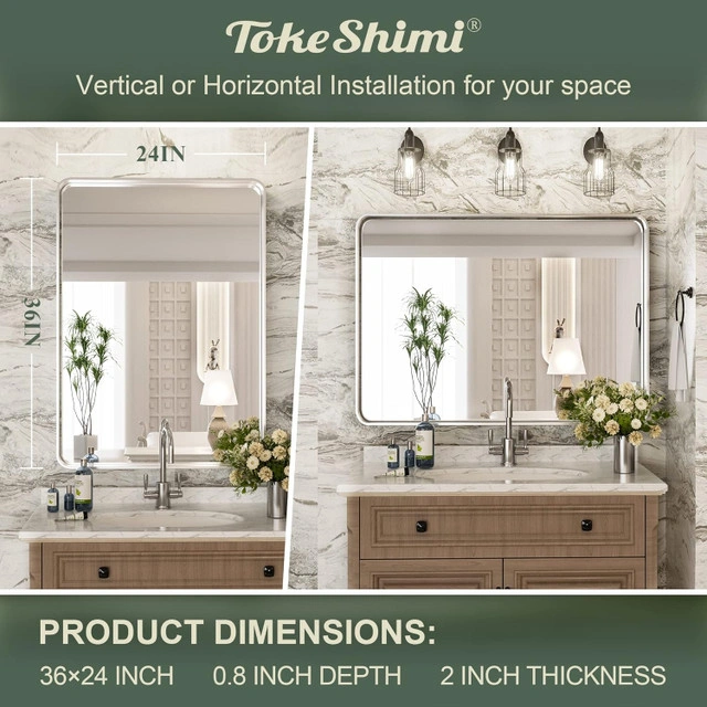 Brand new mirror. It comes in original box with mounting hardware. Retails at Amazon for $181 ($160 + tax). Save your money. Pickup from south London. TokeShimi 24 x 36 Inch Brushed Silver Bathroom Mirror for Wall Brushed Brass Metal Rounded Corner Rectangle Mirror Metal Frame Deep Set Design Hangs Horizontal Or Vertical Product details: Brand: TokeShimi Room type: Bathroom Shape: Rectangular Product Dimensions: 60L x 91W Centimetres Frame material: Aluminum Style: Modern ❥NON-RUSTING BRUSHED SILVER ALUMINUM ALLOY METAL FRAME MIRRO : Durable aluminum alloy combines with oxidation process makes brushed silver frame with unique brush/matte texture, more metallic, non-deformed and non-rusting and more More durable. Will not rust in wet environments. Horizontal/Vertical installation. ❥PRACTICAL AND DECORATIVE ROUNDED CORNER RECTANGLE MIRRORS: DIMENSION (24×36 inch, 0.8 inch depth, 2 inch thickness). Fit in All Kinds of Home Deco.TokeShimi silver vanity mirror has modern, minimalist, farmhouse and industrial style appearance which is the prefect addition to your bathroom, powder room, dining room, living room, hall, etc. ❥STURDY PACKAGE WITH 3 LAYERS FOAM :Tokeshimi brozne farmhouse mirror is secured with customized 3 layer foam in carton box passed all rigorous tests including dropping, impact test which is very sturdy and make sure to provide mirrors in perfect condition for you. ❥HD REFECTION AND 5MM SHATTERPROOF GLASS:Tokeshimi mirror adopts 5-layer float technology to ensure 1:1 restoration of real image, no distortion, fast dispersion of fog and corrosion resistant and not easy to oxidize. Easy to clean.