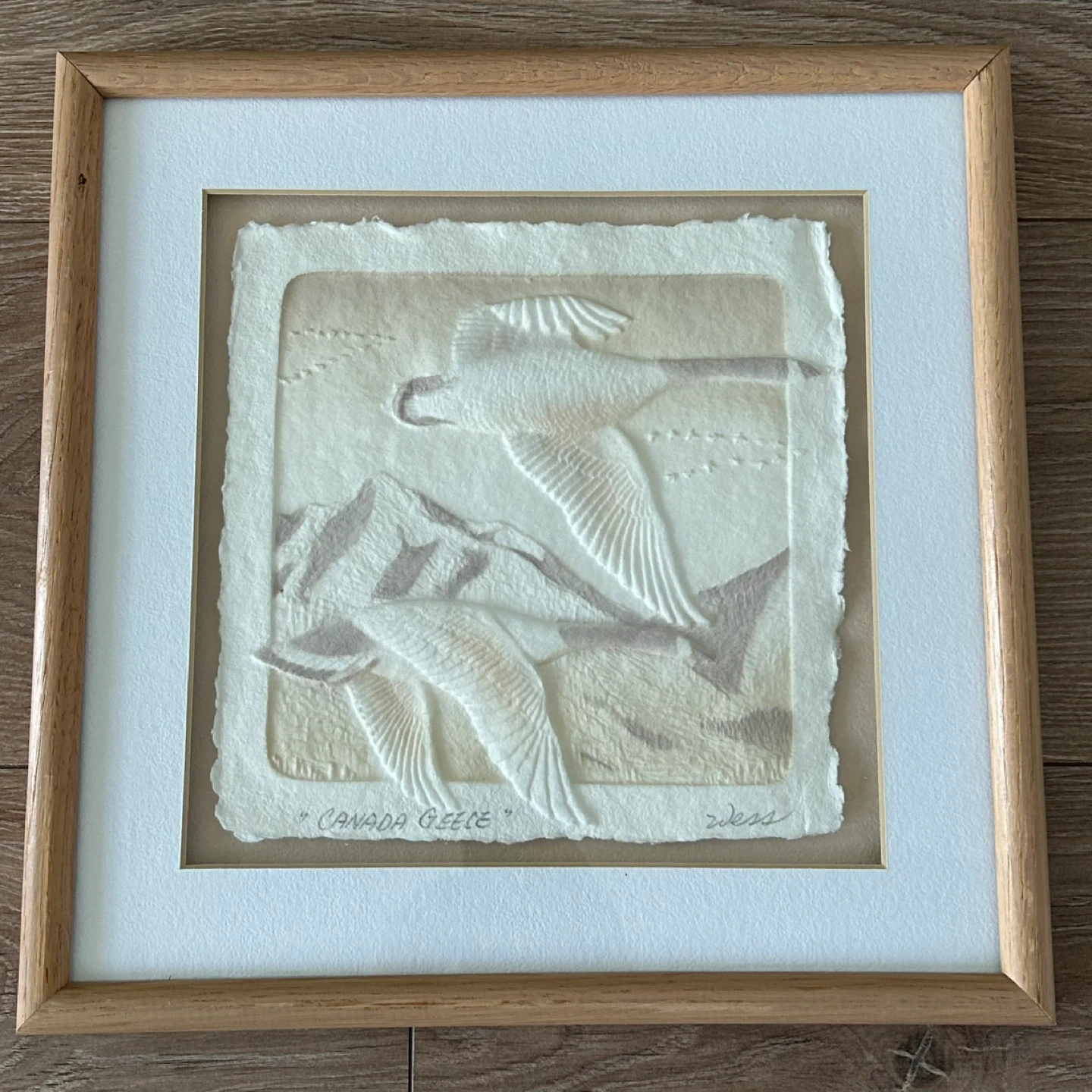 Beautiful vintage framed paper casting titled “Canada Geece”, featuring two Canada geese flying over a mountain landscape. The artwork has a wonderful raised, sculptural texture typical of quality cast paper art, giving the scene a subtle three-dimensional effect.