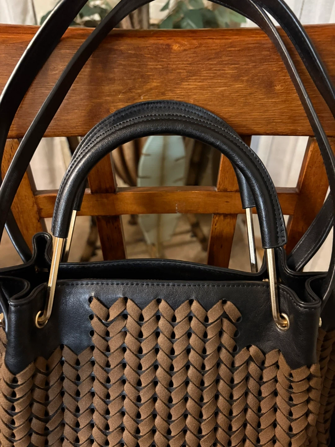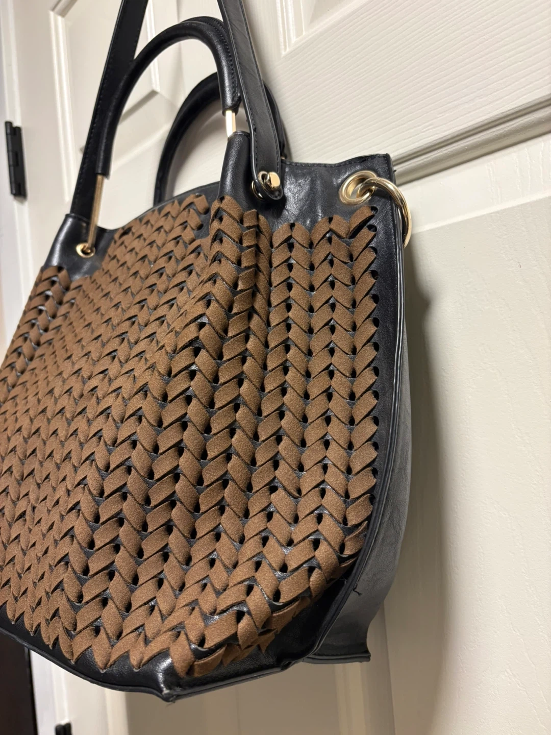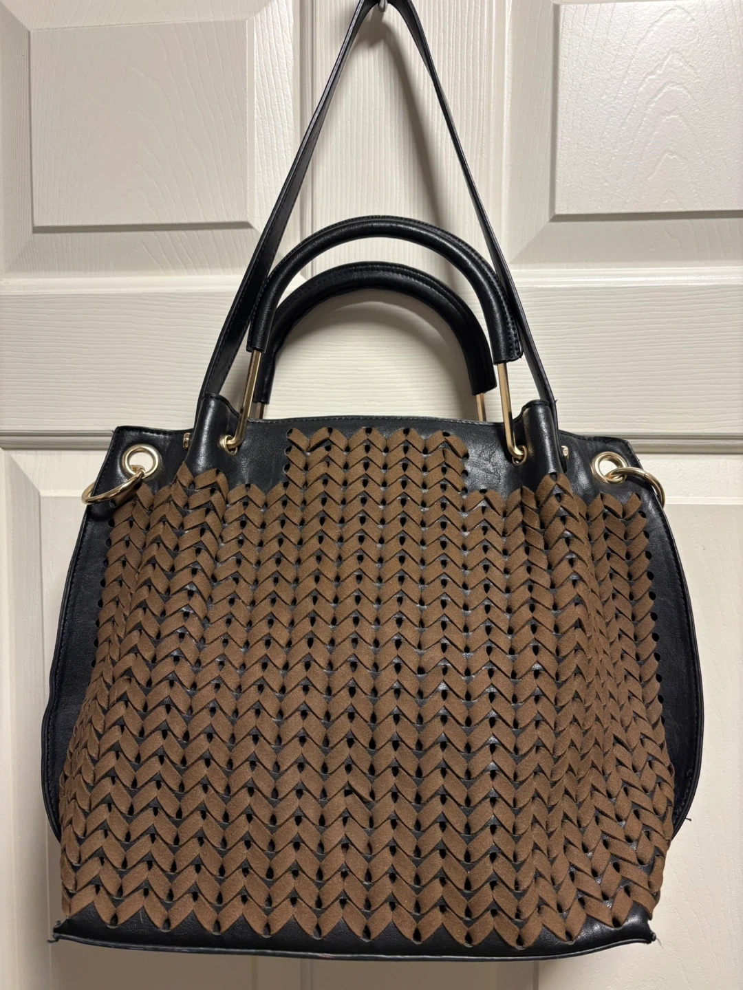 Stylish hobo handbag by Sondra Roberts, featuring a black vegan leather base and a brown woven front panel. It features top handles and a zippered pocket on the back. This bag offers a chic look for everyday use. Great condition, just like new! Pick up in Chestermere.