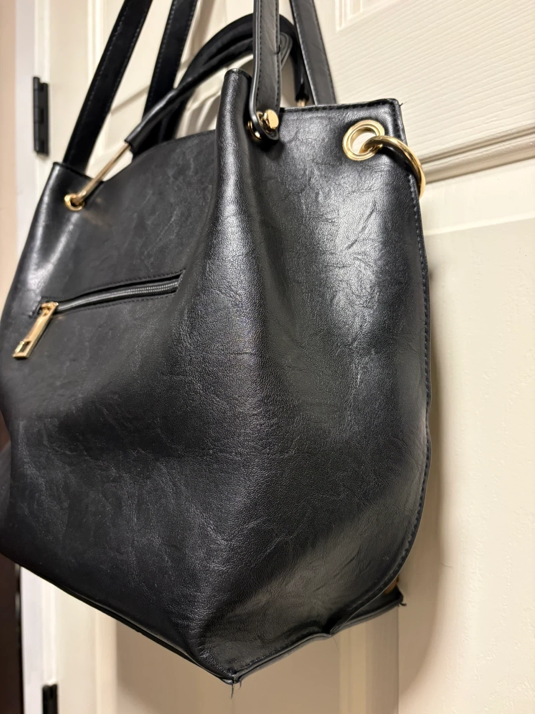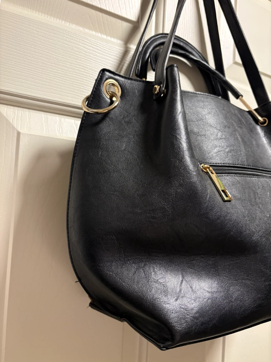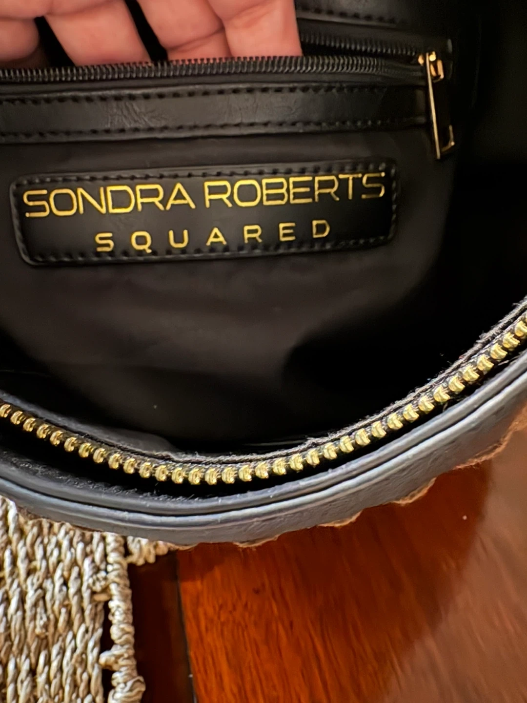 Stylish hobo handbag by Sondra Roberts, featuring a black vegan leather base and a brown woven front panel. It features top handles and a zippered pocket on the back. This bag offers a chic look for everyday use. Great condition, just like new! Pick up in Chestermere.