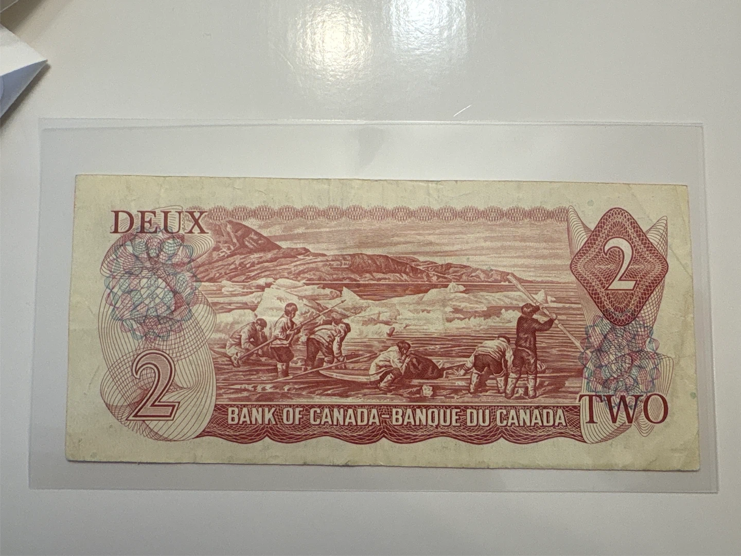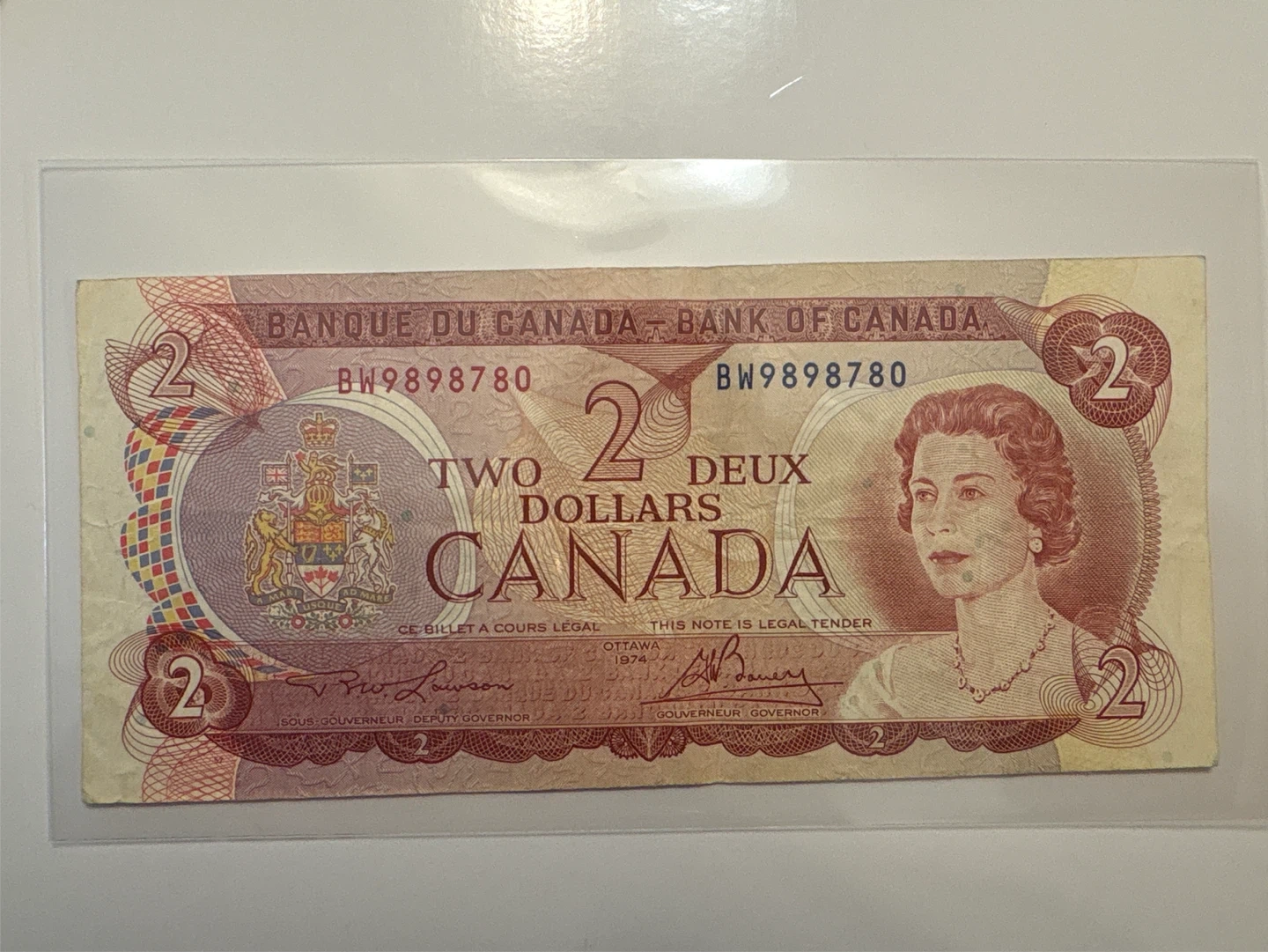 This is a 1974 Bank of Canada two dollar banknote. The front features Queen Elizabeth II, and the back depicts an Arctic scene. It's a collectible piece of Canadian currency.
