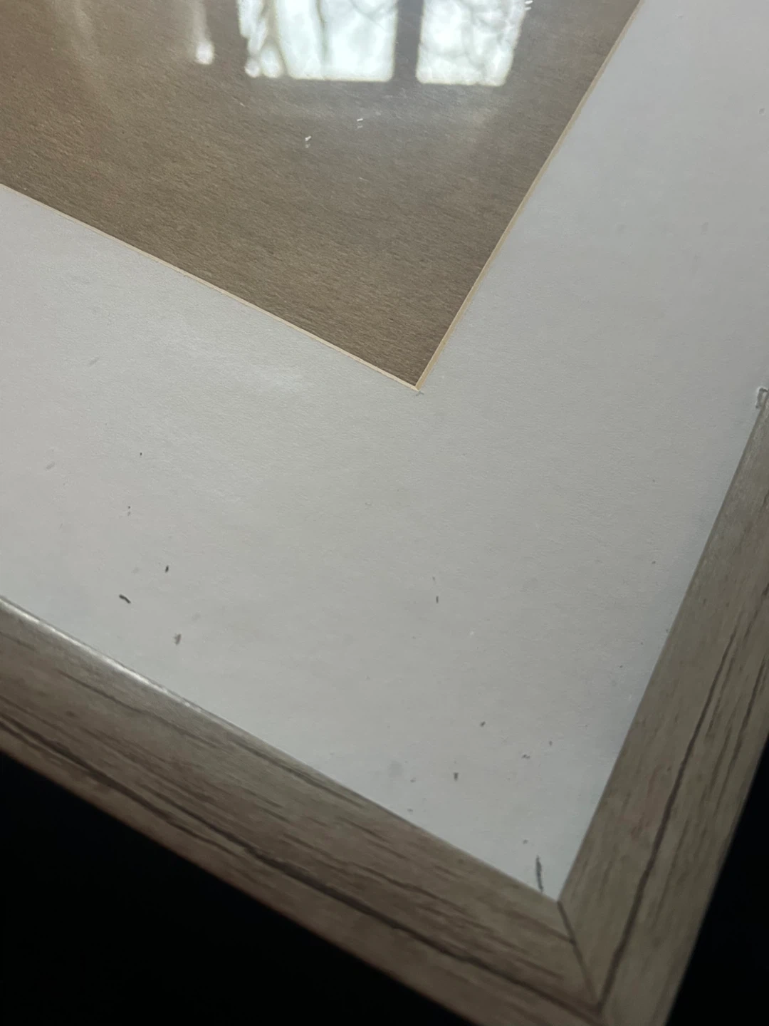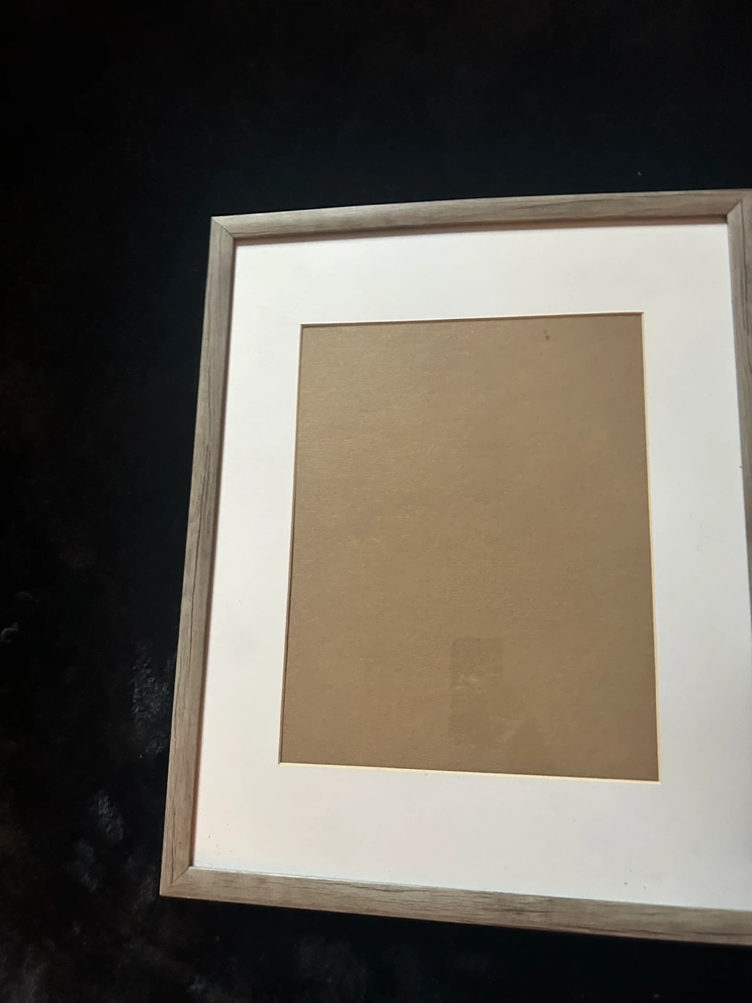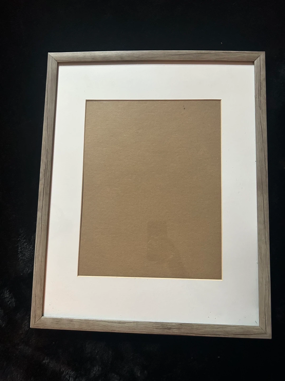 This photo frame has a rustic wood-look finish and a white mat insert. It's suitable for displaying photos or artwork. It's ready to hang with a sawtooth hanger on the back.