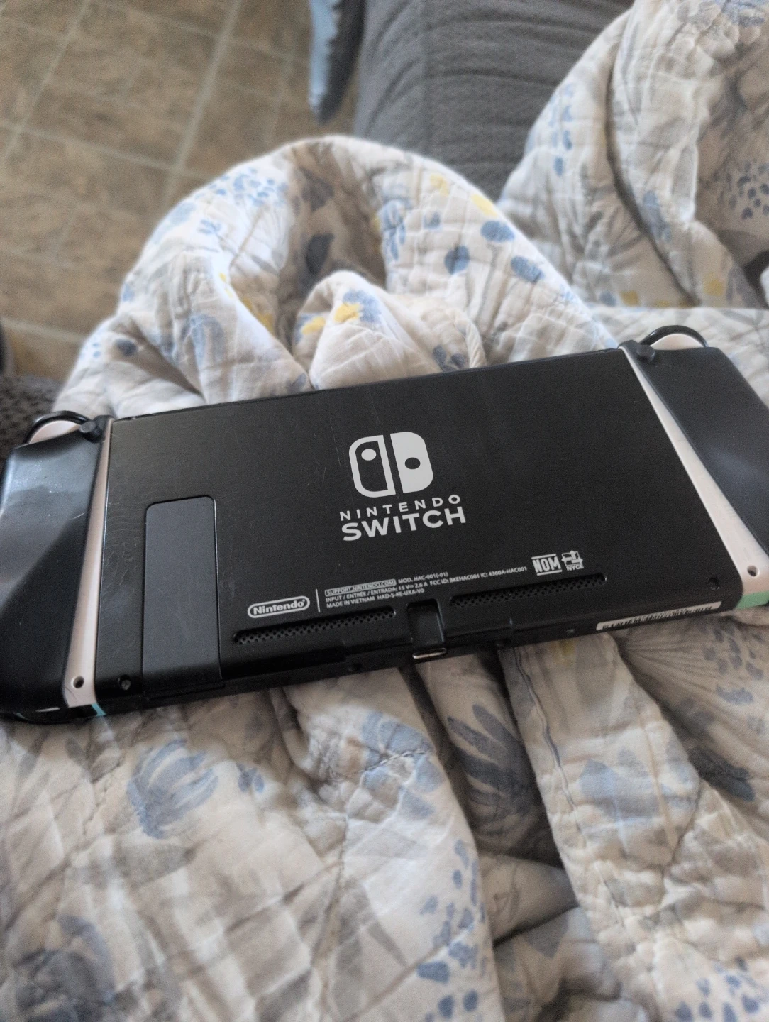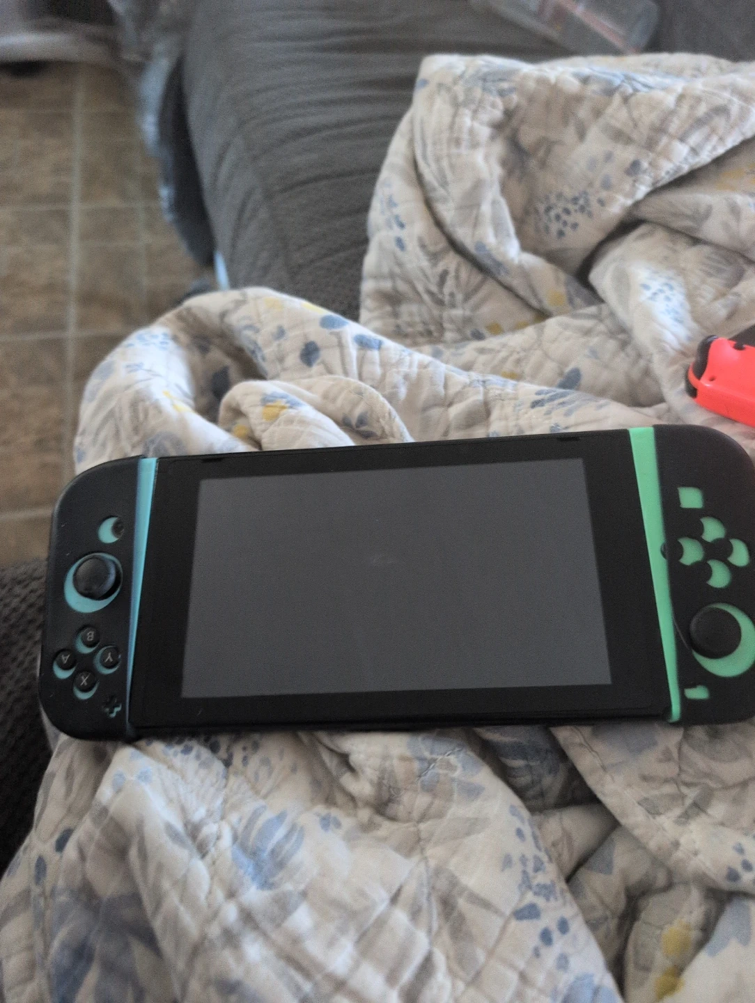 This is a Nintendo Switch gaming console. It's black with teal accents on the controllers. Its compact design makes it easy to take on the go for gaming anywhere!
